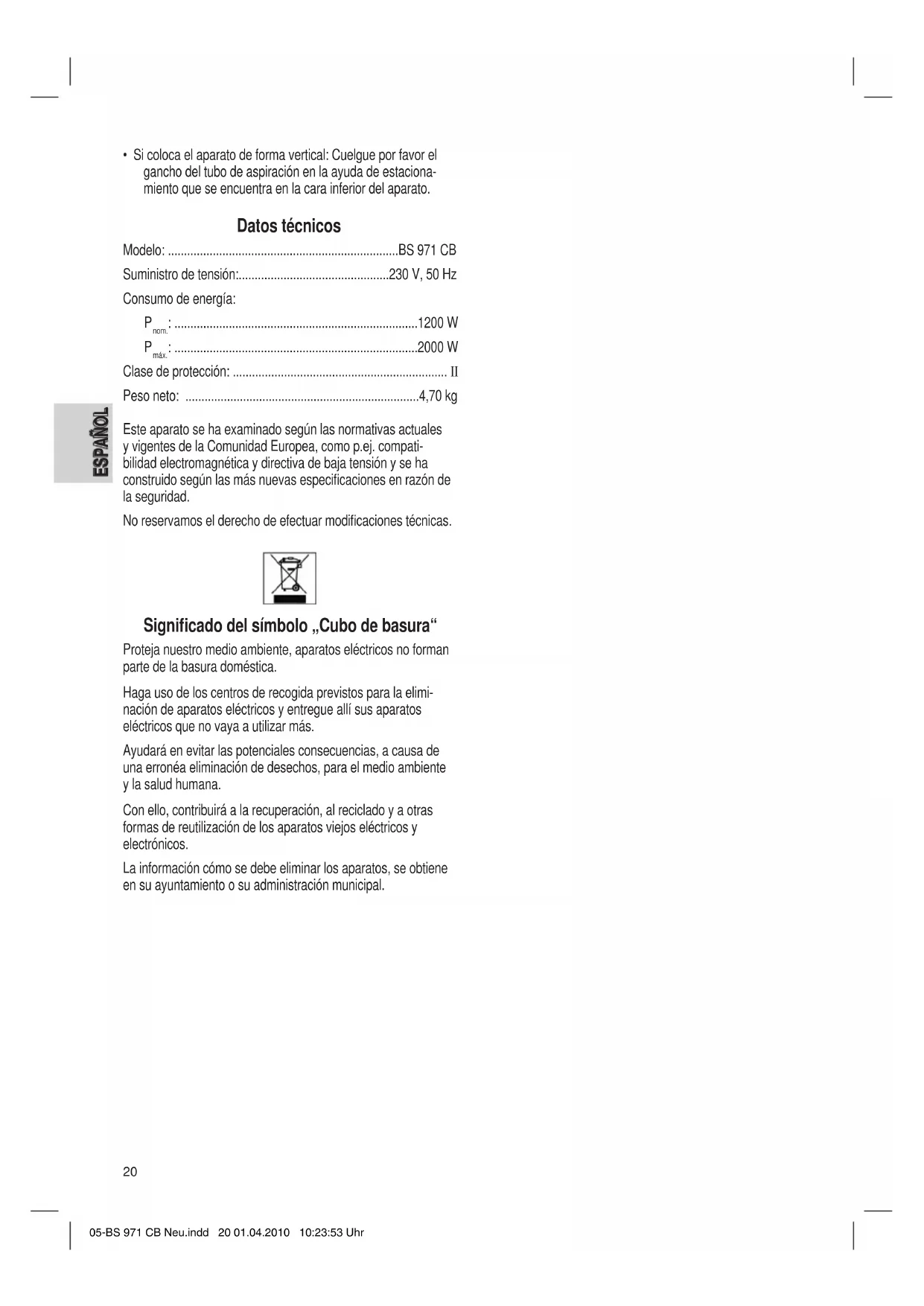 - Se colocar o aspirador na horizontal: pendure por favor o gancho do tubo de aspiração no suporte na base do aspira- dor. Características técnicas Modelo: ........................................................................BS 971 CB Alimentação da corrente: ..........................................230 V, 50 Hz Consumo de energia:
