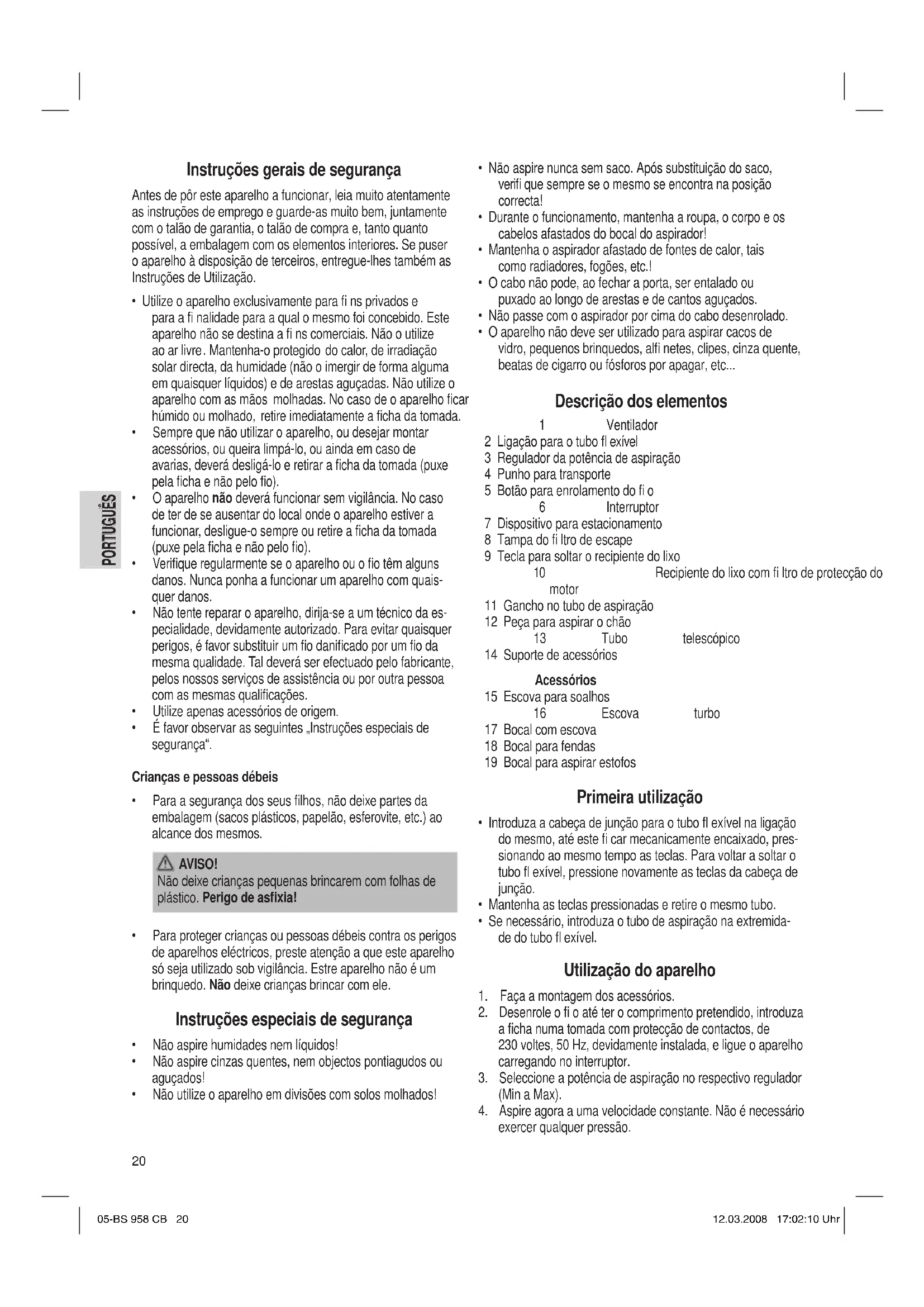 exercer qualquer pressão. 05-BS 1273.indd 2005-BS 958 CB 20 07.03.2008 8:24:37 Uhr12.03.2008 17:02:10 Uhr21 PORTUGUÊS PORTUGUÊS Nota: tome em consideração que o comprimento do fi o é limitado! Regulador da potência de aspiração Potência de aspiração baixa: para cortinas, tecidos delica- dos. Potência de aspiração média: para alcatifas de pelo alto e solos têxteis. Potência de aspiração elevada: para alcatifas, tapetes e solos robustos. Dispositivo de enrolamento do fi o Para desenrolar o fi o, é favor puxá-lo, no máximo, até à marcação amarela. Não o puxe até à marcação vermelha, pois o dispositivo poderá estragar-se. Tais estragos não estão incluídos na garantia. Enrolamento Pressione o botão para enrolamento e vá puxando o fi o. Segure neste para evitar que o mesmo bate contra qualquer lado. Tubo de Aspiração Telescópico Através do tubo de aspiração ajustável na altura é possível uma adaptação individual para a sua altura corporal. Proceda ao desbloqueio do acopla- mento deslocando a tecla na direcção da seta. Desloque o tubo de aspiração para a posição desejada. Para bloquear, solte a tecla, até se ouvir que o acoplamento fi cou engatado. Bocais Bocal para frestas e para escovar: Para aspirar estofos, cortinados, assim como cantos, frestas, etc. Bocal para aspirar estofos: Para a limpeza de estofos, cortinados, etc. Peça para aspirar o chão: Para aspirar alcatifas, tapetes ou superfícies lisas. Solos lisos: Prima com o pé para baixo a alavanca com o símbolo de escova „ “. As escovas fi carão à vista. Alcatifas, tapetes: Ponha com o pé a alavanca no símbolo „