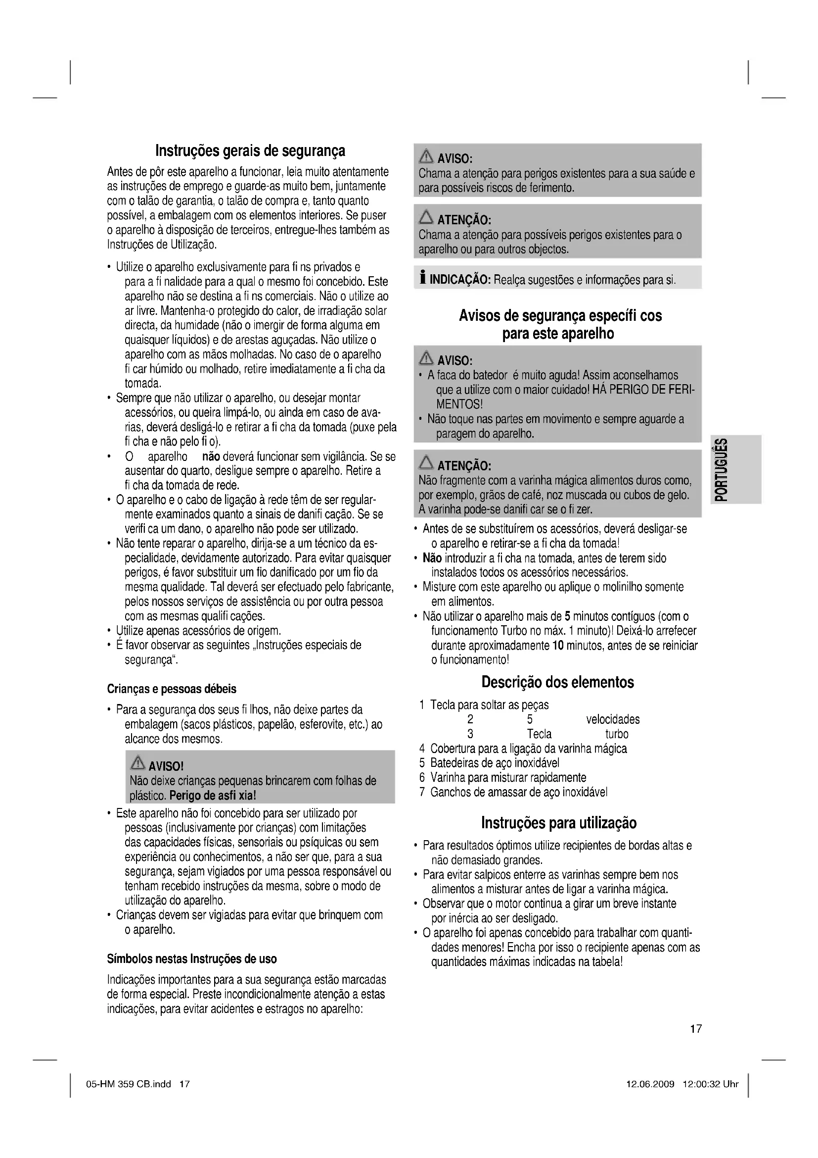 - O aparelho foi apenas concebido para trabalhar com quanti- dades menores! Encha por isso o recipiente apenas com as quantidades máximas indicadas na tabela! 05-HM 359 CB.indd 1705-HM 359 CB.indd 17 12.06.2009 12:00:32 Uhr12.06.2009 12:00:32 Uhr18 PORTUGUÊS PORTUGUÊS Varinha mágica rápida (6) Parta em pedaços pequenos os pedaços grandes de alimentos sólidos antes de os reduzir a puré (máx. Ø 1,5 cm) e junte um pouco de líquido. Funcionamento turbo (3) Para obter momentaneamente o número máximo de rotações. Carregando a tecla em intervalos curtos, consegue-se uma operação intermitente. ATENÇÃO: Não utilizar esta função mais de 1 minuto! Colocação em funcionamento Preparação