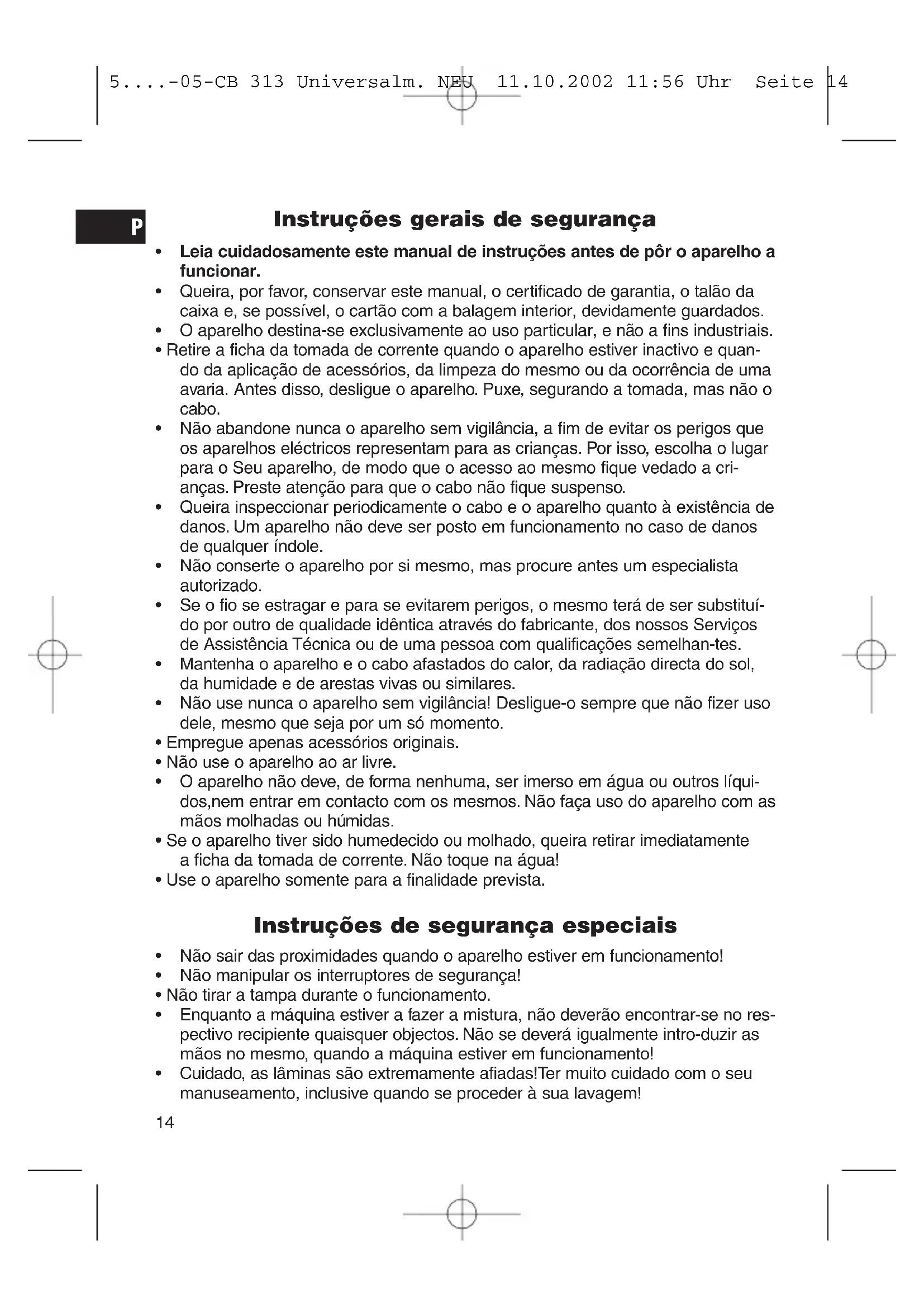 5....-05-CB 313 Universalm. NEU 11.10.2002 11:56 Uhr Seite 15Este aparelho obedece às normas da CE para eliminação de interferências e segurança de baixa tensão e foi fabricado de acordo com os regulamentos mais recentes da técnica de segurança. Reserva-se o direito de alterações! Garantia O aparelho vendido pela nossa empresa tem uma garantia de 24 meses a partir da data da compra (talão). Durante o período de garantia, procederemos à remoção grátis - quer por repa- ração, quer por substituição - de todas as deficiências do aparelho que provenham de erros de material ou de fabricação. O talão de compra consistirá prova desta garantia. Sem o mesmo, não será pos- sível proceder-se a qualquer troca ou reparação grátis. No caso de querer fazer valer a garantia, é favor entregar o aparelho completo na embalagem original, juntamente com o talão de compra, na loja onde aquele tenha sido comprado. Em caso de danos em peças de vidro ou de defeitos em quaisquer acessórios, não será efectuada a substituição do aparelho. Os mesmos serão trocados e expe- didos gratuitamente. Não enviar neste caso o aparelho para a fábrica; bastará encomendar o acessório em questão! Não estão incluídas na garantia a limpeza, a manutenção ou a troca de peças que se desgastem, devendo tais despesas ser reembolsadas. A garantia deixará de ter validade, sempre que tenha havido intervenção alheia no aparelho. Após a garantia Após a expiração do prazo de garantia, poderão ser efectuados arranjos por pes- soal especializado, ou pelos nossos serviços de reparações, contra reembolso.