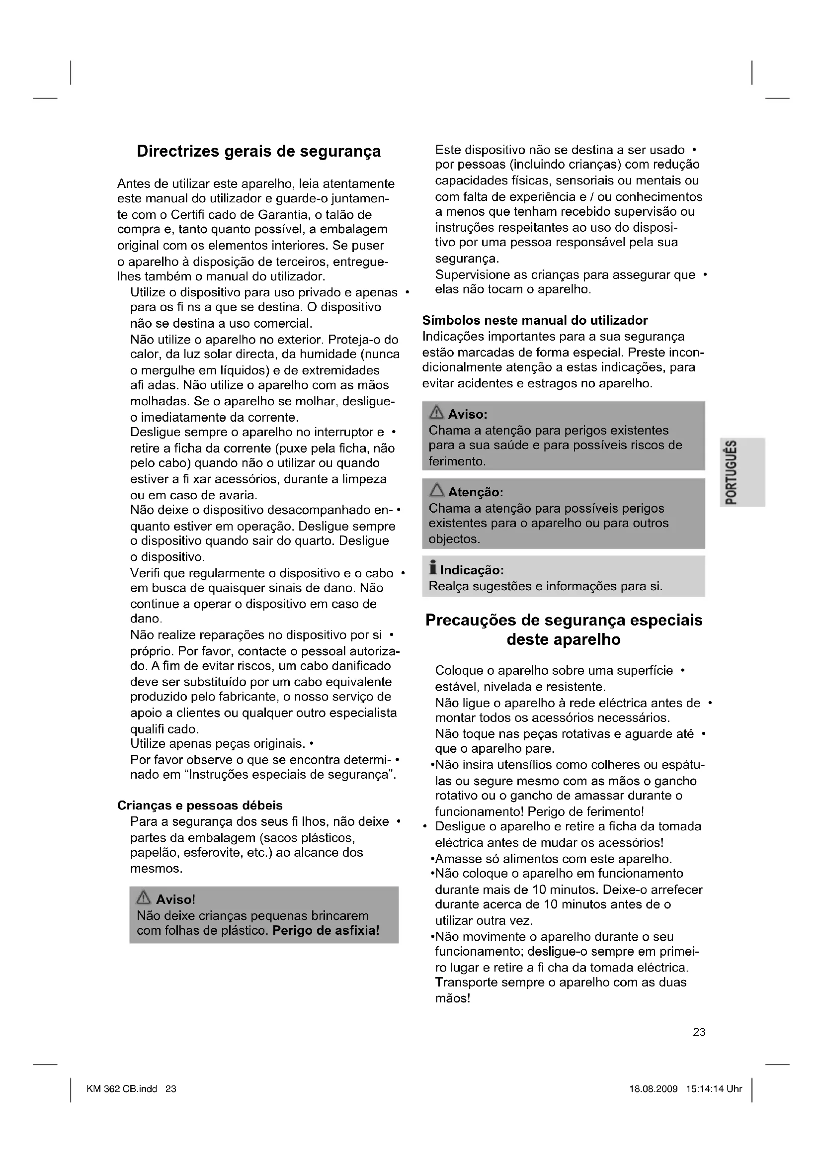 KM 362 CB.indd 24KM 362 CB.indd 24 18.08.2009 15:14:14 Uhr18.08.2009 15:14:14 Uhr25 Quando seleccionar a velocidade observe tam- bém as referências das receitas. Indicação: Para misturar melhor a massa de pão ► grossa o aparelho começa com a veloci- dade 1 a uma velocidade baixa. Passados cerca de 1,5 minutos a velocidade passa automaticamente para a velocidade 2. A luz LED verde apresenta este processo. Volte à velocidade 1 se esta não for a velocidade que deseja. O botão da velocidade electrónica evita ► a sobrecarga do motor. Com uma carga elevada as rpm (rotações por minuto) são automaticamente reduzidas numa defi nição da velocidade. A luz do LED da defi nição da velocidade seleccionada mantém-se. Funcionamento de curta duração: não ► coloque o aparelho em funcionamento com massa de pão grossa durante mais de 10 minutos e deixe-o arrefecer durante 10 minutos depois. Utilize o resguardo de salpicos para a ► massa líquida.
