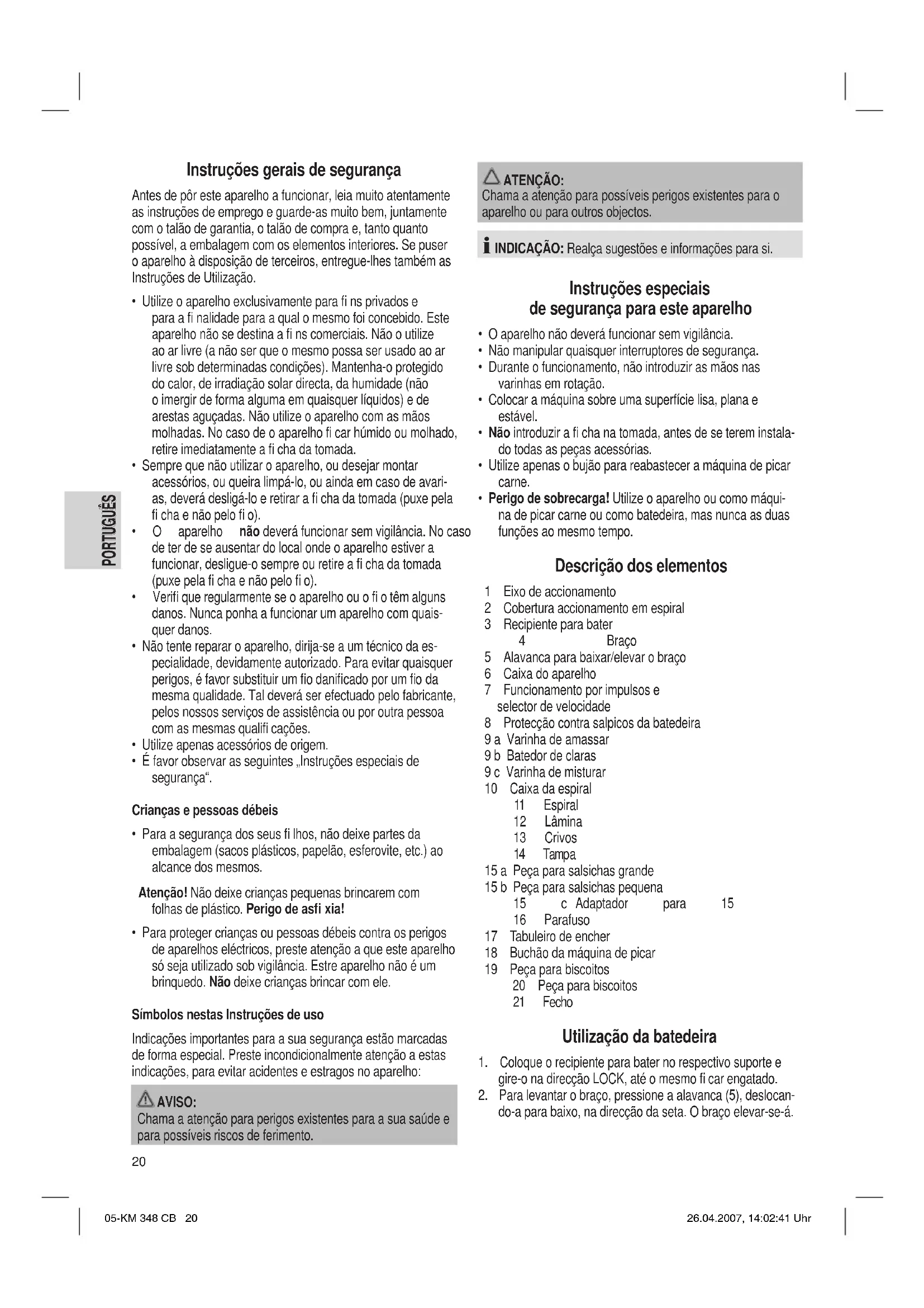 - Perigo de sobrecarga! Utilize o aparelho ou como máqui- na de picar carne ou como batedeira, mas nunca as duas funções ao mesmo tempo. Descrição dos elementos 1 Eixo de accionamento 2 Cobertura accionamento em espiral 3 Recipiente para bater 4 Braço 5 Alavanca para baixar/elevar o braço 6 Caixa do aparelho 7 Funcionamento por impulsos e selector de velocidade 8 Protecção contra salpicos da batedeira 9 a Varinha de amassar 9 b Batedor de claras 9 c Varinha de misturar 10 Caixa da espiral 11 Espiral 12 Lâmina 13 Crivos 14 Tampa 15 a Peça para salsichas grande 15 b Peça para salsichas pequena 15 c Adaptador para 15 16 Parafuso 17 Tabuleiro de encher 18 Buchão da máquina de picar 19 Peça para biscoitos 20 Peça para biscoitos 21 Fecho Utilização da batedeira