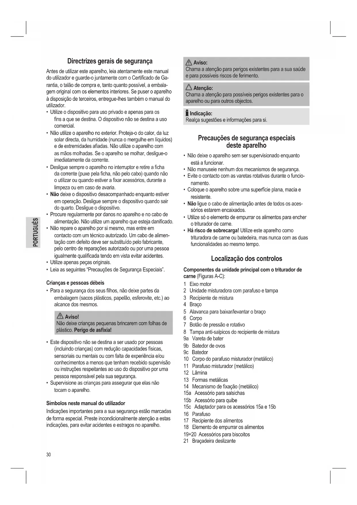 - Supervisione as crianças para assegurar que elas não tocam o aparelho. Símbolos neste manual do utilizador Indicações importantes para a sua segurança estão marcadas de forma especial. Preste incondicionalmente atenção a estas indicações, para evitar acidentes e estragos no aparelho. Aviso: Chama a atenção para perigos existentes para a sua saúde e para possíveis riscos de ferimento. Atenção: Chama a atenção para possíveis perigos existentes para o aparelho ou para outros objectos. Indicação: Realça sugestões e informações para si. Precauções de segurança especiais deste aparelho