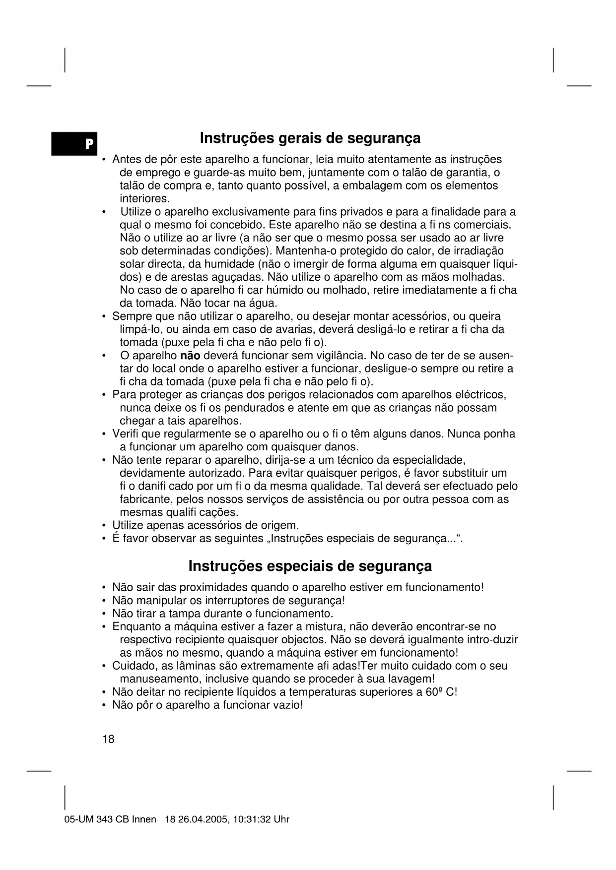- Deixar o recipiente secar. eg. Este aparelho foi controlado nos termos das actuais directivas da CEE aplicáveis, tais como inocuidade electromagnética e directiva sobre baixa tensão, e fabricado de acordo com as mais novas prescrições da segurança técnica. Reserva-se o direito de alterações! Garantia O aparelho vendido pela nossa empresa tem uma garantia de 24 meses a partir da data da compra (talão). Durante o período de garantia, procederemos à remoção grátis - por reparação, ou, segundo a nossa decisão, por substituição - das defi ciências do aparelho ou dos acessórios*) que provenham de erros de material ou de fabricação. A prestação de serviços relacionados com a garantia não prolongarão a mesma, nem iniciarão um novo prazo de garantia! O talão de compra consistirá prova desta garantia. Sem o mesmo, não será possível proceder-se a qualquer troca ou reparação grátis. Em caso de garantia, entregue o aparelho completo, juntamente com o talão de compra, na loja onde o mesmo foi comprado. *) No caso de danos em quaisquer acessórios, não será efectuada automática- mente uma substituição completa do aparelho. Contacte neste caso a nossa hotline! Danos causados por quebras de peças de vidro ou de plástico terão de ser pagos pelo cliente! Não estão incluídos na garantia quaisquer defeitos de acessórios ou de peças que se desgastem (como, por exemplo, carvões do motor, varinhas, correias do motor, telecomandos, escovas de dentes, folhas de serra, etc.), nem a limpeza, a manutenção ou a substituição de peças que se desgastem, devendo tais despe- sas ser reembolsadas! A garantia terminará sempre que tenha havido intervenção alheia nos aparelhos. 05-UM 343 CB Innen 20 26.04.2005, 10:31:33 UhrP