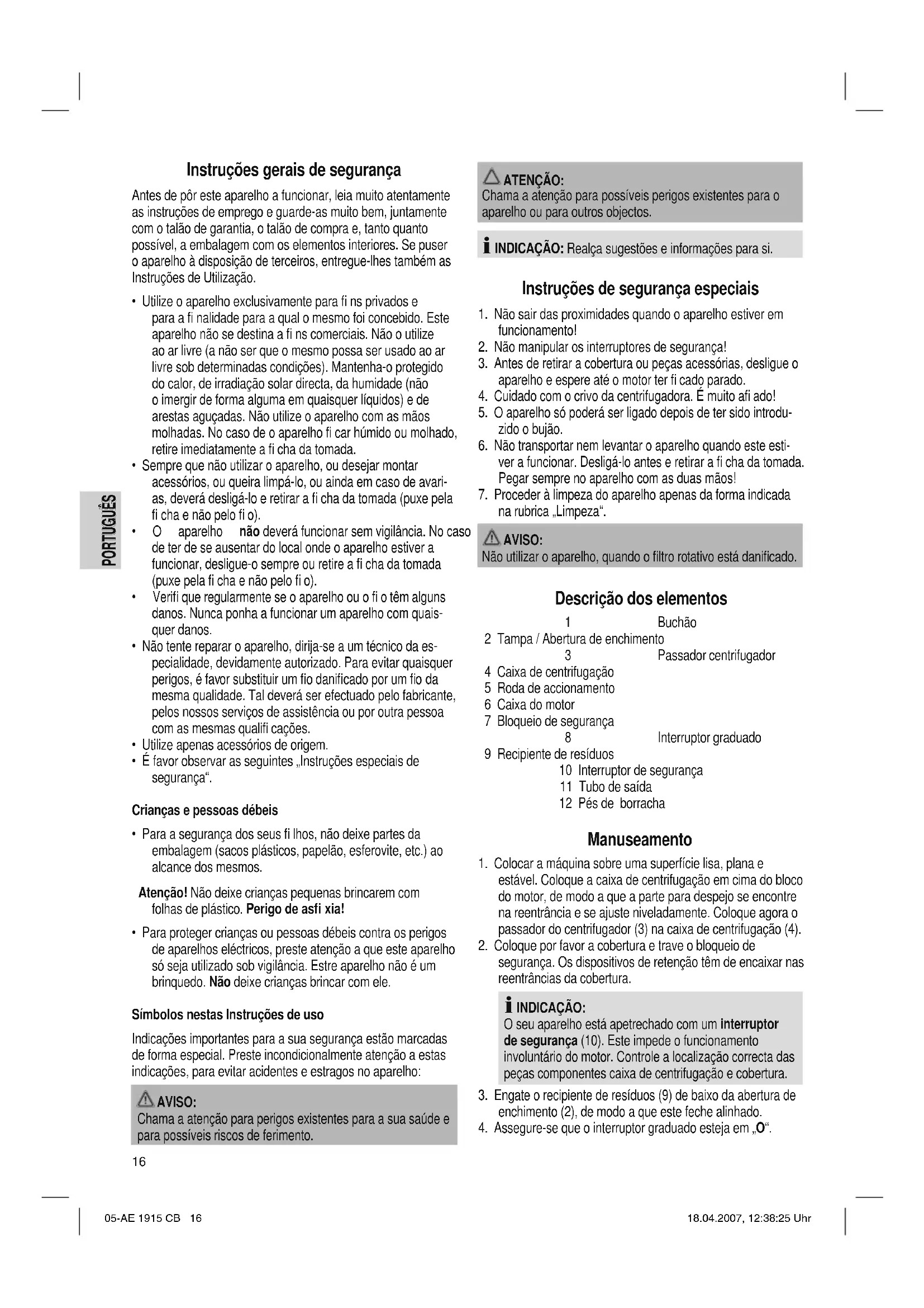 - O aparelho não funciona Ajuda: Verifi que a ligação à corrente. Verifi que a posição do interruptor. Outras causas possíveis: O aparelho está apetrechado com um interruptor de segurança (10). Este impede o funcionamento involuntário do motor. Ajuda: Controle a posição correcta das peças componentes, fi ltro centrifugador e cobertura. Características técnicas Modelo: ...................................................................... AE 1915 CB Alimentação da corrente:..............................220-240 V, 50/60 Hz Consumo de energia:...................................................500-700 W Categoria de protecção:.............................................................. ΙΙ Tempo de funcionamento curto: ..........................................3 min. Este aparelho foi controlado nos termos das actuais directivas da CEE aplicáveis, tais como inocuidade electromagnética e directiva sobre baixa tensão, e fabricado de acordo com as mais novas prescrições da segurança técnica. Reserva-se o direito de alterações! 05-AE 1915 CB 17 18.04.2007, 12:38:26 Uhr18 PORTUGUÊS PORTUGUÊS Garantia O aparelho vendido pela nossa empresa tem uma garantia de 24 meses a partir da data da compra (talão). Durante o período de garantia, procederemos à remoção grátis - por reparação, ou, segundo a nossa decisão, por substituição - das defi ciências do aparelho ou dos acessórios que provenham de erros de material ou de fabricação. A prestação de serviços relacionados com a garantia não prolongarão a mesma, nem iniciarão um novo prazo de garantia! O talão de compra consistirá prova desta garantia. Sem o mesmo, não será possível proceder-se a qualquer troca ou reparação grátis. Em caso de garantia, entregue o aparelho completo, juntamen- te com o talão de compra, na loja onde o mesmo foi comprado. Não estão incluídos na garantia quaisquer defeitos de acessórios ou de peças que se desgastem, nem a limpeza, a manutenção ou a substituição de peças que se desgastem, devendo tais despesas ser reembolsadas! A garantia terminará sempre que tenha havido intervenção alheia nos aparelhos. Após a garantia Após a expiração do prazo de garantia, poderão ser efectuados arranjos por pessoal especializado, ou pelos nossos serviços de reparações, contra reembolso. Signifi cado do símbolo „contentor do lixo“ Poupe o nosso meio ambiente, não deite aparelhos eléctricos para o lixo doméstico. Dirija-se ao locais destinados à recolha especial de aparel- hos eléctricos e entregue aí os aparelhos que não pretende continuar a utilizar. Desta forma, contribuirá para ajudar a evitar os potenciais efei- tos perniciosos que um falso depósito de objectos usados terão, tanto no que diz respeito ao ambiente, como à saúde humana. Dará igualmente a sua contribuição para o reaproveitamento de materiais, para a reciclagem e outras formas de aproveitamento de aparelhos eléctricos e electrónicos usados. Receberá, nas autarquias e juntas de freguesia, informações sobre os locais onde poderá entregar tais aparelhos. 05-AE 1915 CB 18 18.04.2007, 12:38:28 UhrPORTUGUÊS