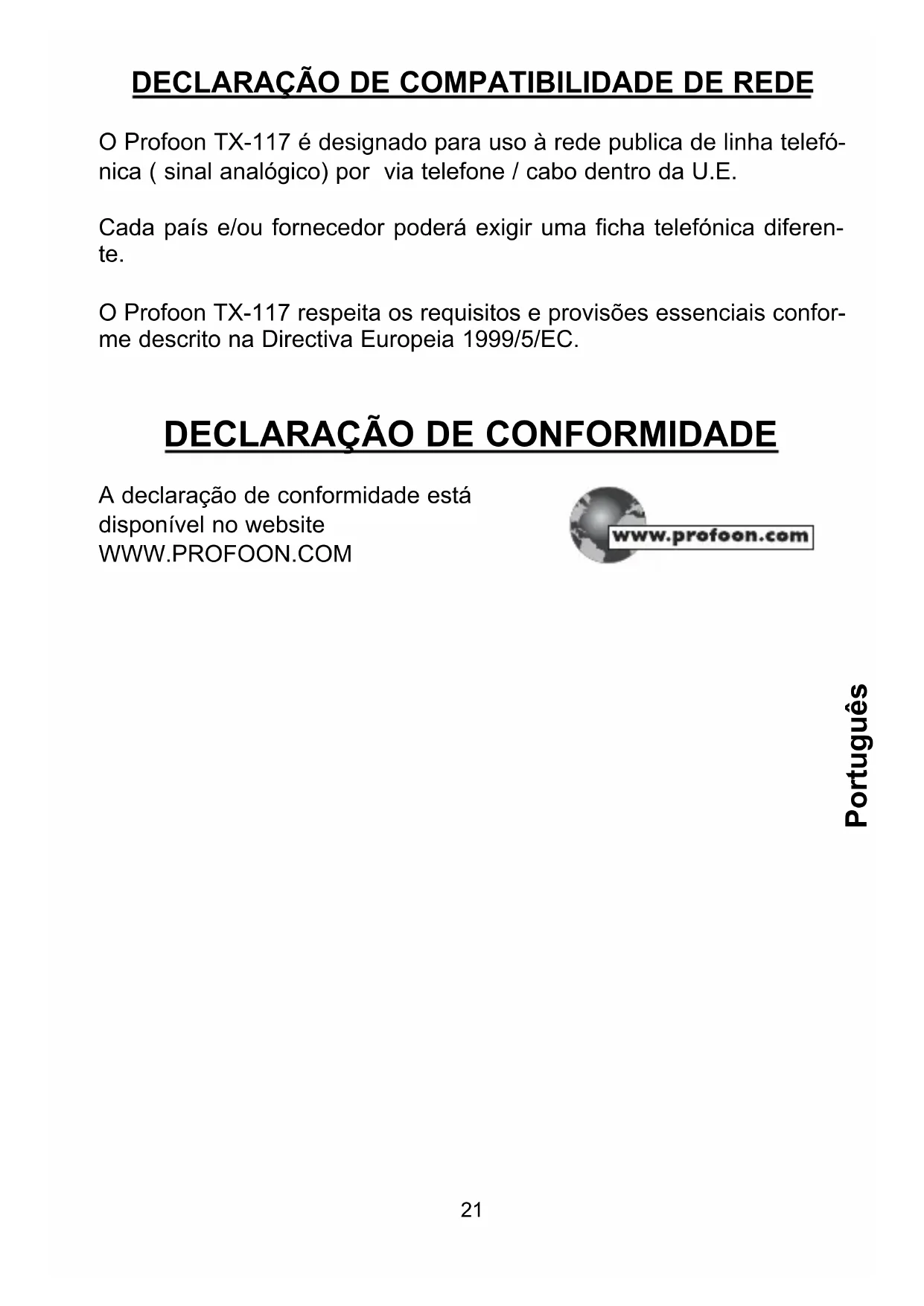 O Profoon TX-117 é designado para uso à rede publica de linha telefó- nica ( sinal analógico) por via telefone / cabo dentro da U.E. Cada país e/ou fornecedor poderá exigir uma ficha telefónica diferen- te. O Profoon TX-117 respeita os requisitos e provisões essenciais confor- me descrito na Directiva Europeia 1999/5/EC.