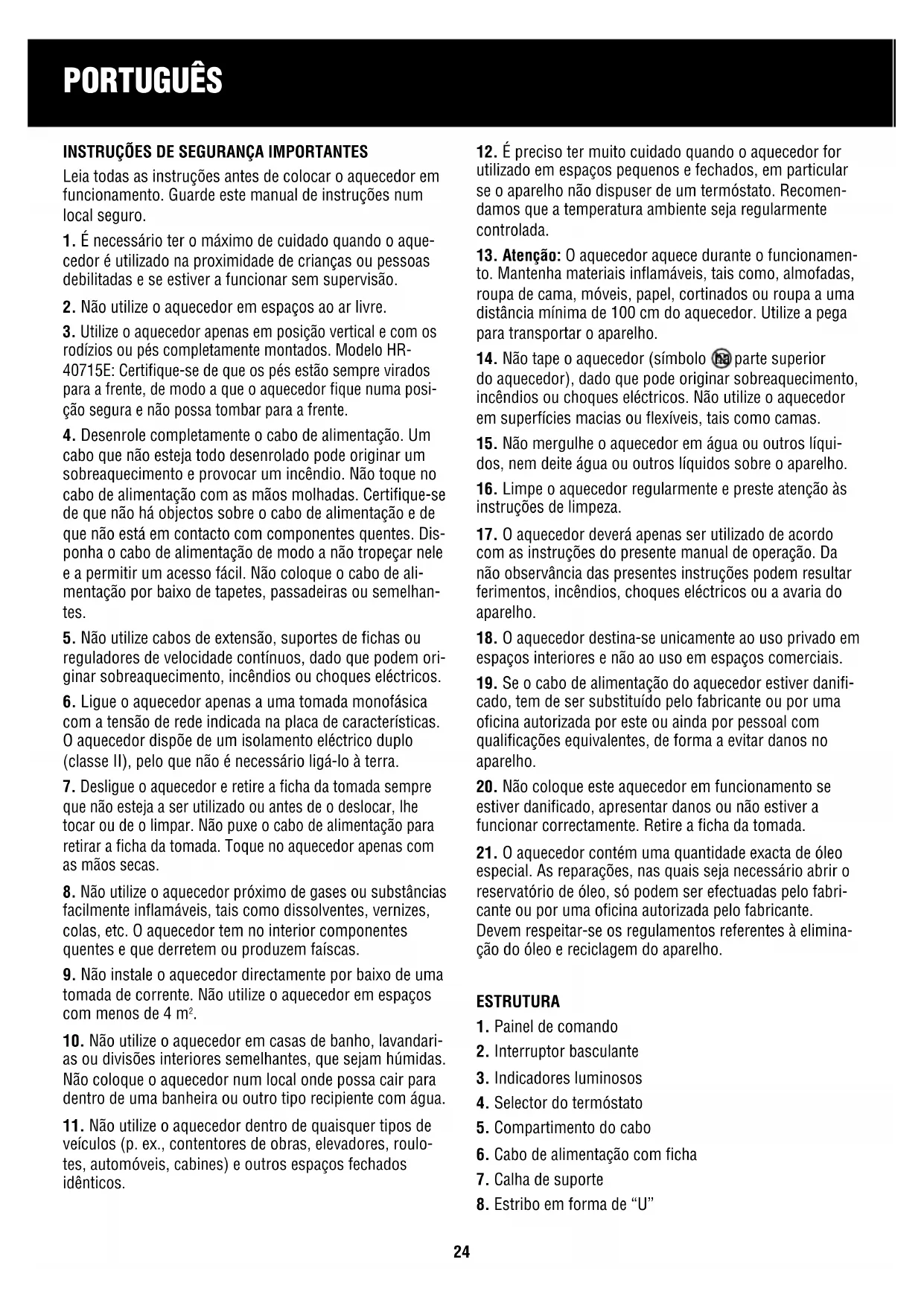 rodízios ou pés completamente montados. Modelo HR- 40715E: Certifique-se de que os pés estão sempre virados para a frente, de modo a que o aquecedor fique numa posi- ção segura e não possa tombar para a frente.