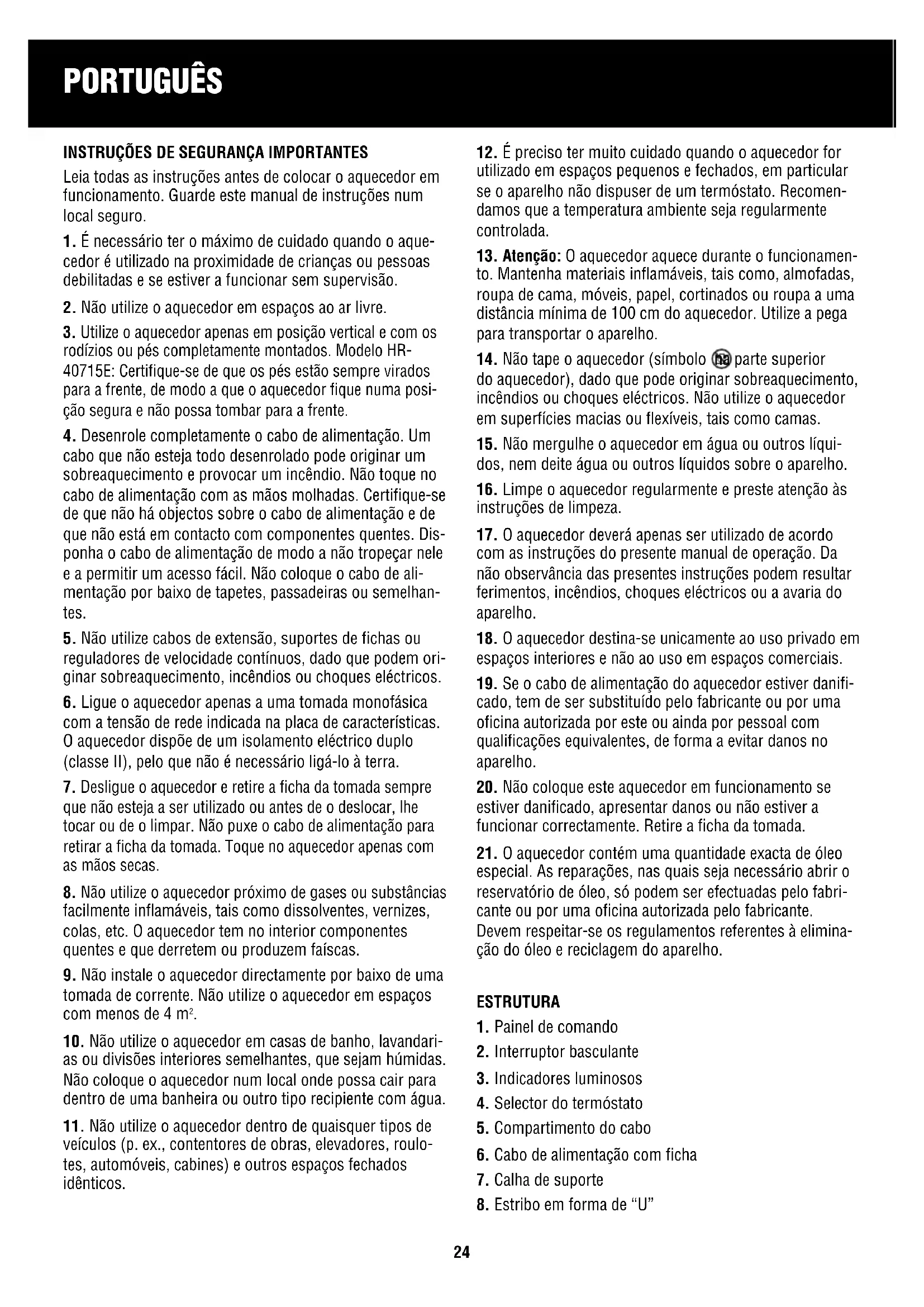 rodízios ou pés completamente montados. Modelo HR- 40715E: Certifique-se de que os pés estão sempre virados para a frente, de modo a que o aquecedor fique numa posi- ção segura e não possa tombar para a frente.