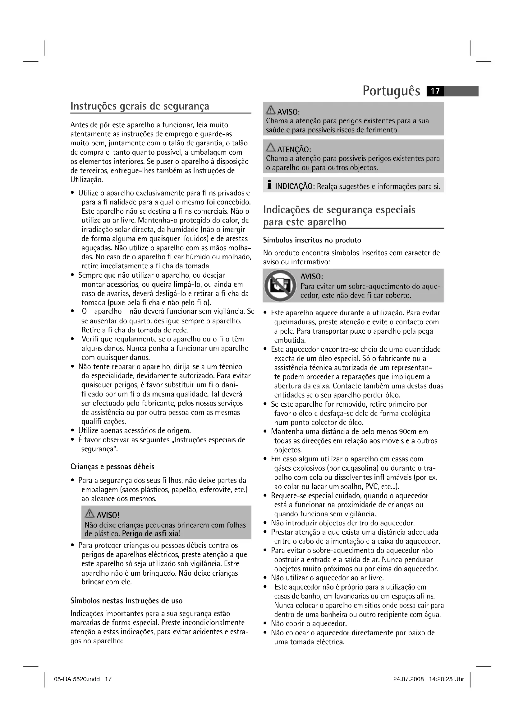 - Não colocar o aquecedor directamente por baixo de uma tomada eléctrica. 05-RA 5520.indd 1705-RA 5520.indd 17 24.07.2008 14:20:25 Uhr24.07.2008 14:20:25 UhrPortuguês