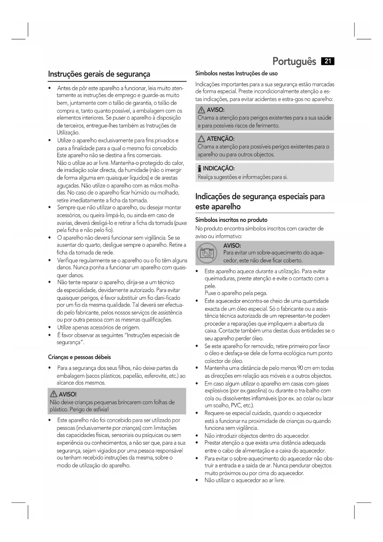 - Esteaparelhonãofoiconcebidoparaserutilizadopor pessoas (inclusivamente por crianças) com limitações das capacidades físicas, sensoriais ou psíquicas ou sem experiênciaouconhecimentos,anãoserque,paraasua segurança, sejam vigiados por uma pessoa responsável ou tenham recebido instruções da mesma, sobre o modo de utilização do aparelho. Símbolos nestas Instruções de uso Indicações importantes para a sua segurança estão marcadas de forma especial. Preste incondicionalmente atenção a es- tasindicações,paraevitaracidenteseestra-gosnoaparelho: AVISO: Chama a atenção para perigos existentes para a sua saúde e para possíveis riscos de ferimento. ATENÇÃO: Chama a atenção para possíveis perigos existentes para o aparelho ou para outros objectos. INDICAÇÃO: Realça sugestões e informações para si. Indicações de segurança especiais para este aparelho Símbolos inscritos no produto No produto encontra símbolos inscritos com caracter de avisoouinformativo: AVISO: Para evitar um sobre-aquecimento do aque- cedor, este não deve ficar coberto.