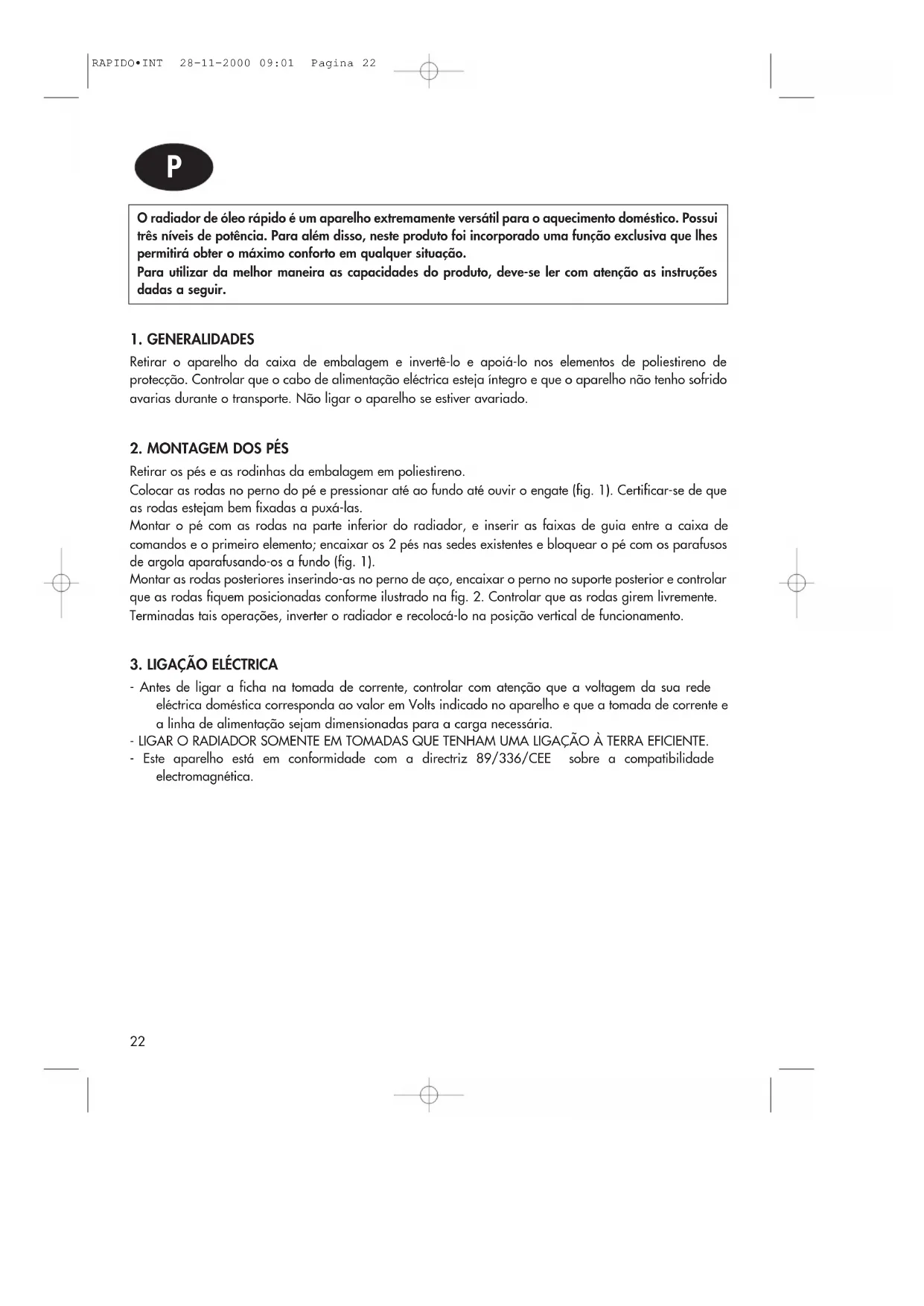 RAPIDO•INT 28-11-2000 09:01 Pagina 2122 O radiador de óleo rápido é um aparelho extremamente versátil para o aquecimento doméstico. Possui três níveis de potência. Para além disso, neste produto foi incorporado uma função exclusiva que lhes permitirá obter o máximo conforto em qualquer situação. Para utilizar da melhor maneira as capacidades do produto, deve-se ler com atenção as instruções dadas a seguir.