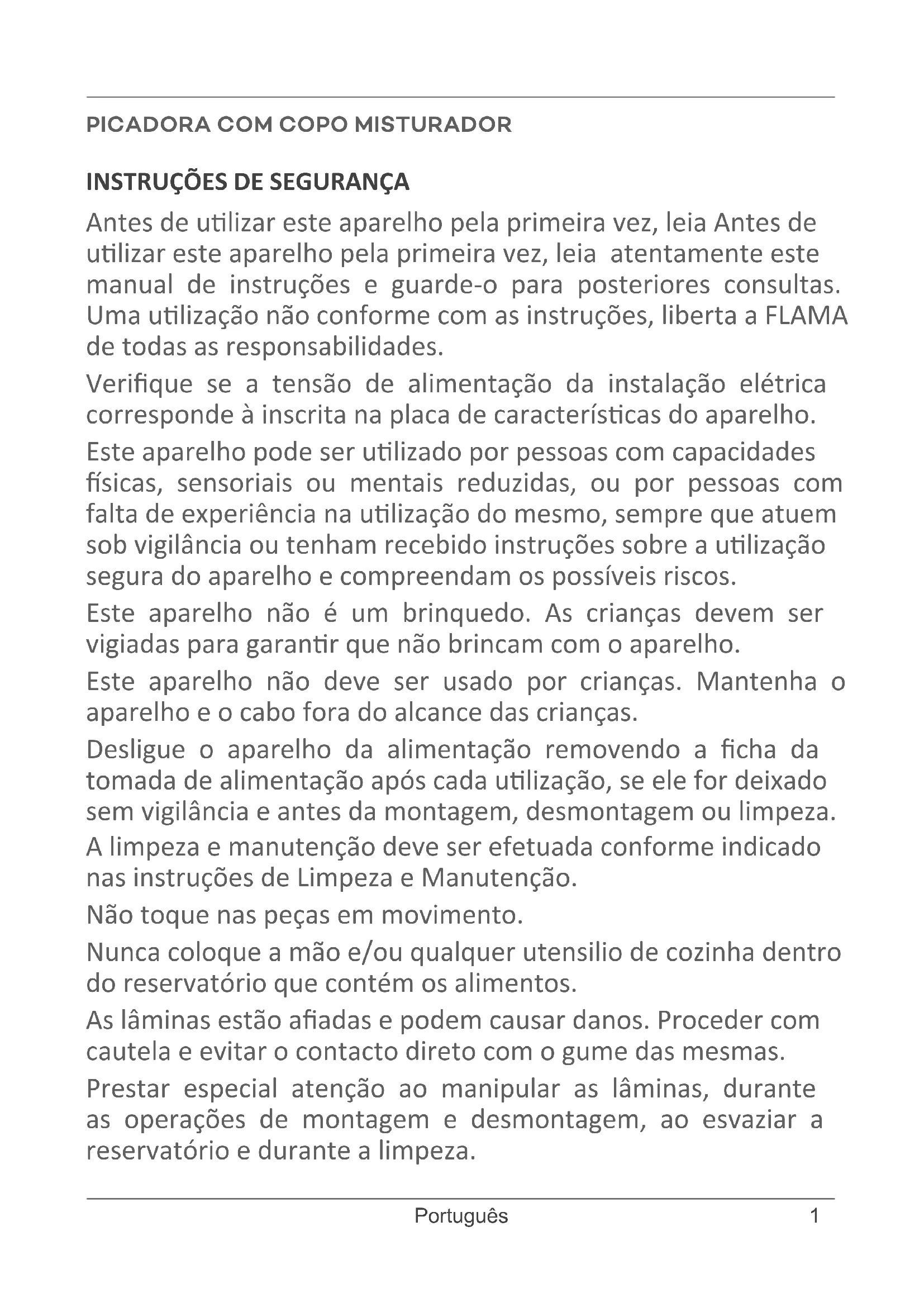 Antes de utilizesar este aparelho pela primarya vez, leia Antes de utilizesar este aparelho pela primarya vez, leia atentamente este manual de instruções e guarde-o para posteriores consultas. Umautilização não conformsme com as instruções,liberta a FLAMA de todas as responsabilitádes.