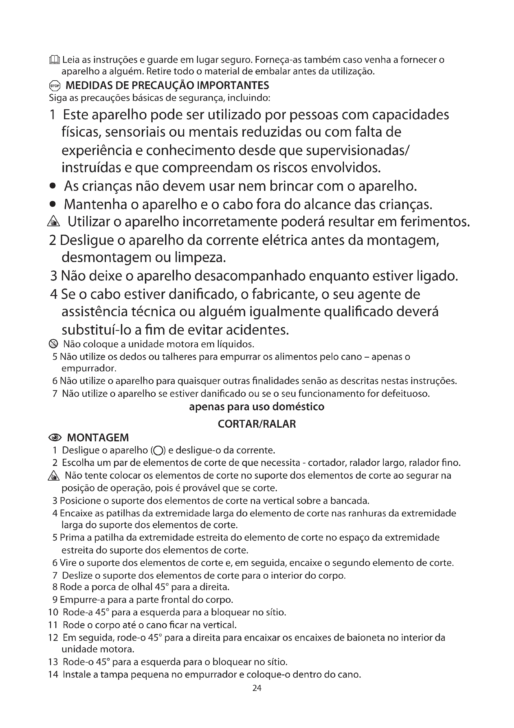 5 Não utilize os dedos ou talheres para empurar os alimentos pelo cano – apenas o empurrador.