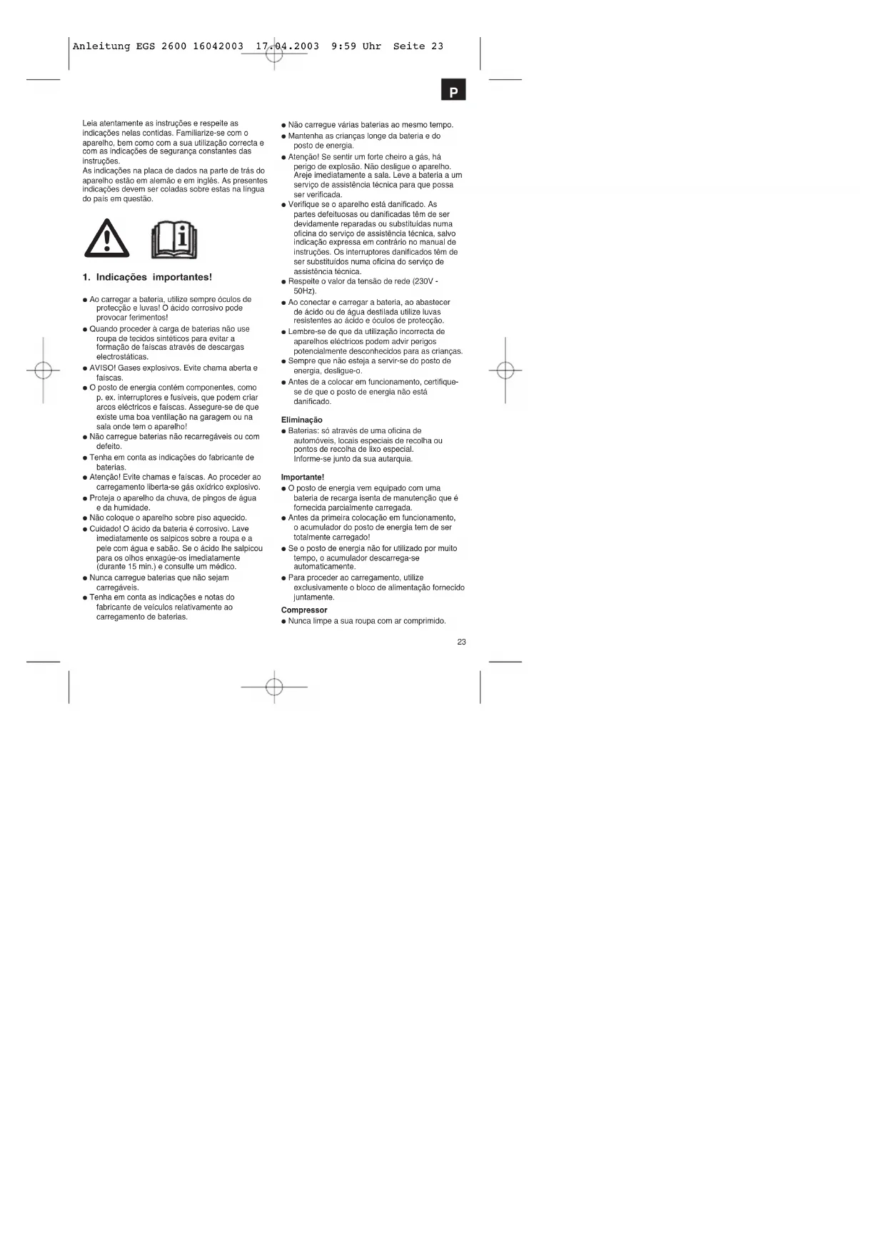 Anleitung EGS 2600 16042003 17.04.2003 9:59 Uhr Seite 2223 Leia atentamente as instruções e respeite asindicações nelas contidas. Familiarize-se com oaparelho, bem como com a sua utilização correcta ecom as indicações de segurança constantes dasinstruções.As indicações na placa de dados na parte de trás doaparelho estão em alemão e em inglês. As presentesindicações devem ser coladas sobre estas na línguado país em questão.