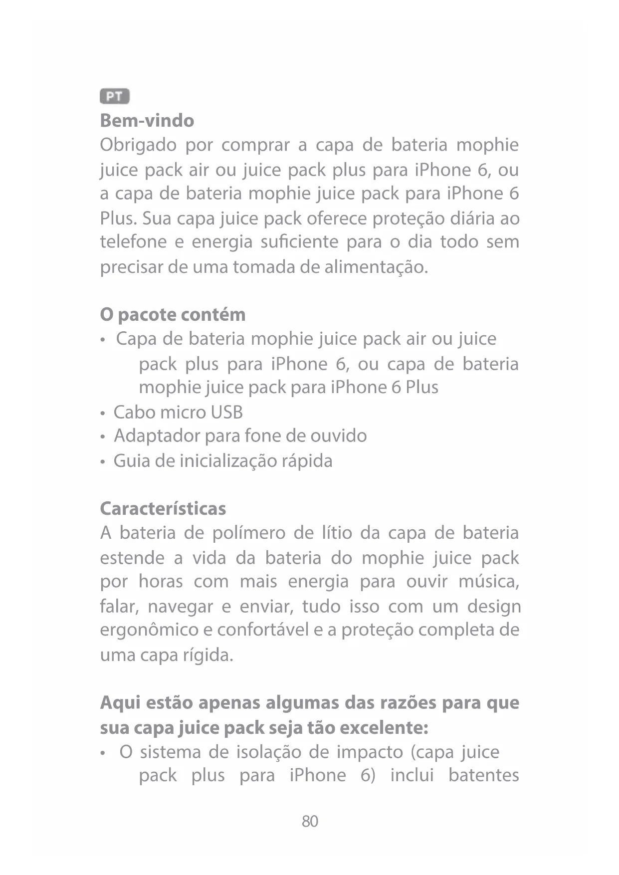 Obrigado por comprar a capa de bateria morphie juice pack air ou juice pack plus para iPhone 6, ou a capa de bateria morphie juice pack para iPhone 6 Plus. Sua capa juice pack oferece protecao diaria ao telephone e energia sufficiente para o dia todo sem precisar de uma tomada de alimentacao.