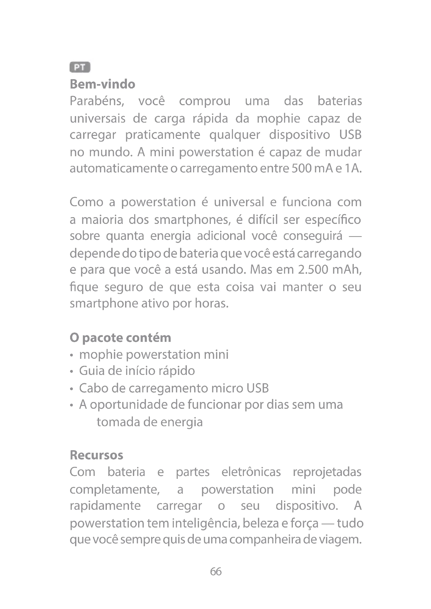 - Consulte o revendedor ou um técnico especializado para suporte. CUIDADO: Para estar em conformidade com os limites do dispositivo digital Classe B, conforme a Parte 15 das Regras FCC, todos os periféricos75 devem ser protegidos e aterrados. A operação com periféricos não certicados ou com cabos não protegidos pode resultar em interferência de rádio ou recepção. MODIFICAÇÃO: Quaisquer alterações ou modicações a este dispositivo poderiam invalidar a garantia. Perguntas frequentes A powerstation mini consegue carregar o meu iPhone? Pode apostar. A powerstation é completamente compatível com todo iPhone e a maioria dos smartphones. Eu posso carregar o meu iPad com a powerstation mini? Não é recomendado. Sugerimos a mophie powerstation XL, mophie powerstation PRO ou a mophie powerstation duo para carregar dispositivos de tablet. A powerstation mini consegue carregar o meu dispositivo? A powerstation mini foi projetada para carregar uma variedade de dispositivos USB - especicamente smartphones. Fizemos amplos testes em uma variedade de produtos e podemos garantir que76 este dispositivo é completamente compatível com a maioria dos dispositivos disponíveis hoje. Vá para mophie.com e verique o gráco de compatibilidade para ver se o seu dispositivo é compatível. Que porta é usada para carregar a powerstation mini e que porta é usada para carregar o meu dispositivo? Conecte o seu cabo usando a porta USB maior e retangular para carregar o seu dispositivo. A porta USB menor e micro é usada para recarregar a powerstation. Eu posso carregar a mini powerstation a partir da porta USB de um computador? Sim, a powerstation será carregada a partir de qualquer porta USB de corrente alta — disponível na maioria dos computadores. Portas de corrente baixa disponíveis em alguns computadores, assim como portas USB em teclados e hubs, podem não carregar efetivamente a powerstation. Por que os LEDs não estão piscando enquanto a powerstation mini está carregando? Após conectar a uma fonte de alimentação, os indicadores de status LED começarão a piscar indicando carregamento. As luzes apagarão após 30 segundos, permitindo uma boa noite de descanso. Lembre-se de vericar os indicadores de status antes de desconectar para garantir que a powerstation está completamente carregada.77 Quantos ciclos de carga são possíveis com a powerstation mini? A powerstation é recarregável por mais de 500 ciclos (Estes são ciclos completos. Ciclos parciais não contam como cheios. Então, você pode carregar a sua powerstation 10% do total 10 vezes antes de contar como um ciclo completo.) Não tenha medo de experimentar! Eu posso carregar o meu dispositivo enquanto carrego a powerstation mini? Desculpe. A powerstation não tem a capacidade de carregamento simultâneo enquanto ela própria está sendo carregada. Carregue a powerstation separadamente dos seus outros dispositivos. Quando eu tiver conectado o meu dispositivo, como faço para começar a carregá-lo? A powerstation começará automaticamente a carregar o seu dispositivo, assim que você conectá-los um com o outro. O que é a política de devolução da mophie? A mophie reserva-se o direito de reivindicar uma taxa de re-estoque de 20% mediante devolução. (Para a nossa “Política de Devolução” completa, vá para mophie.com)78 Уважаемый покупатель! Примите наши поздравления, Вы приобрели одно из универсальных зарядных устройств mophie с функцией быстрой зарядки и поддержкой практически любого существующего USB- устройства. Зарядное устройство powerstation mini поддерживает автоматическое переключение зарядного тока между 500 мА и 1 А. Поскольку зарядное устройство powerstation является универсальным устройством и работает с большинством смартфонов, сложно определить точное значение получаемой дополнительной электроэнергии, поскольку это зависит от характеристик заряжаемого аккумулятора, а также режима работы зарядного устройства. Однако учитывая емкость 2 500 мАч, можно забыть о подзарядке смартфона на много часов и доверить эту задачу powerstation. В комплект входят: