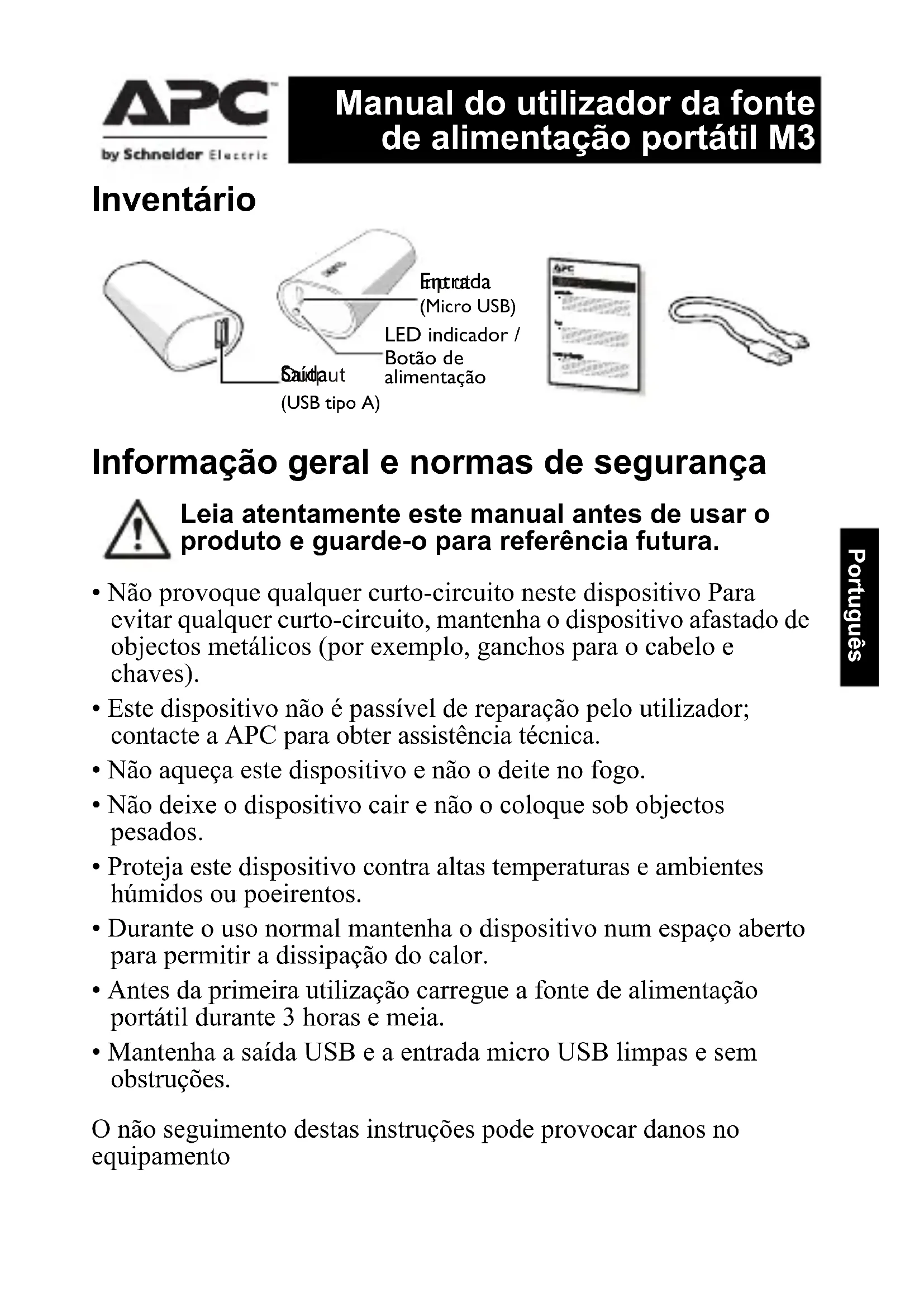F)© 2015 APC by Schneider Electric. APC, o logótipo APC e Back-UPS são propriedade da Schneider Electric Industries S.A.S., ou respetivas empresas afiliadas. Todas as outras marcas registadas são propriedade dos respectivos proprietários. PT 990-5593 01/2015 Português Resolução de problemas Apoio ao Cliente da APC by Schneider Electric IT a nível mundial Para apoio ao cliente específico para um país, visite a Web da APC by Schneider Electric, em www.apc.com. Problema / Possível causa Solução A fonte de alimentação portátil não carrega O carregador USB pode não estar a funcionar devidamente ou o computador está no modo de suspensão. Experimente usar outro carregador USB ou reactive o computador se este estiver no modo de suspensão. Os contactos do cabo micro USB e do conector estão gastos. Experimente um novo conector micro USB. A fonte de alimentação portátil não carrega alguns dispositivos. A fonte de alimentação portátil pode não ter conseguido reconhecer e detectar os dispositivos a ela ligados. Alguns cabos USB existentes no mercado podem não funcionar bem com a fonte de alimentação M3. Para resolver este problema, prima o botão de alimentação na fonte de alimentação M3 para iniciar o carregamento do dispositivo. Se a fonte de alimentação continuar a não carregar o dispositivo, substitua o cabo pelo cabo original que vinha com a fonte de alimentação. Ocorreu uma situação de sobrecarga e o LED da fonte de alimentação M3 está cor-de- laranja e intermitente. A fonte de alimentação M3 está a carregar um dispositivo e a sua corrente de saída USB excede o valor especificado. Desligue o dispositivo a ser carregado da fonte de alimentação M3. A fonte de alimentação portátil chegou ao fim da sua vida útil ou houve uma falha. Em caso de falha, contacte o fornecedor APC by Schneider Electric local ou agência APC by Schneider Electric.język polski Elementy do montażu Informacje ogólne i dotyczące bezpieczeństwa Przed użyciem tego produktu, przeczytaj uważnie ten podręcznik i zachowaj do wykorzystania w przyszłości.
