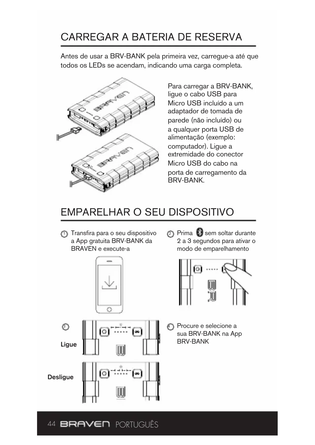 Antes de usar a BRV-BANK pela primeira vez, carregue-a até que todos os LEDs se acendam, indicando uma carga completa. Para carregar a BRV-BANK, ligue o cabo USB para Micro USB incluído a um adaptador de tomada de parede (não incluído) ou a qualquer porta USB de alimentação (exemplo: computador). Ligue a extremidade do conector Micro USB do cabo na porta de carregamento da BRV-BANK. Transra para o seu dispositivo a App gratuita BRV-BANK da BRAVEN e execute-a Prima sem soltar durante 2 a 3 segundos para ativar o modo de emparelhamento Procure e selecione a sua BRV-BANK na App BRV-BANK