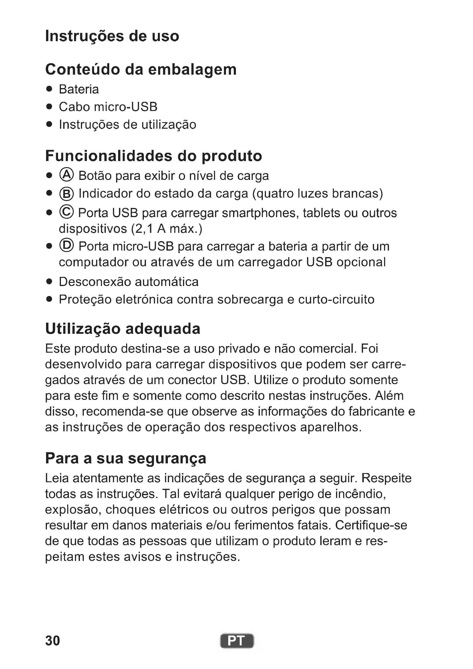 Proteção eletrónica contra sobrecarga e curto-circuito Utilização adequada Este produto destina-se a uso privado e não comercial. Foi desenvolvido para carregar dispositivos que podem ser carre- gados através de um conector USB. Utilize o produto somente para este m e somente como descrito nestas instruções. Além disso, recomenda-se que observe as informações do fabricante e as instruções de operação dos respectivos aparelhos. Para a sua segurança Leia atentamente as indicações de segurança a seguir. Respeite todas as instruções. Tal evitará qualquer perigo de incêndio, explosão, choques elétricos ou outros perigos que possam resultar em danos materiais e/ou ferimentos fatais. Certique-se de que todas as pessoas que utilizam o produto leram e res- peitam estes avisos e instruções.31