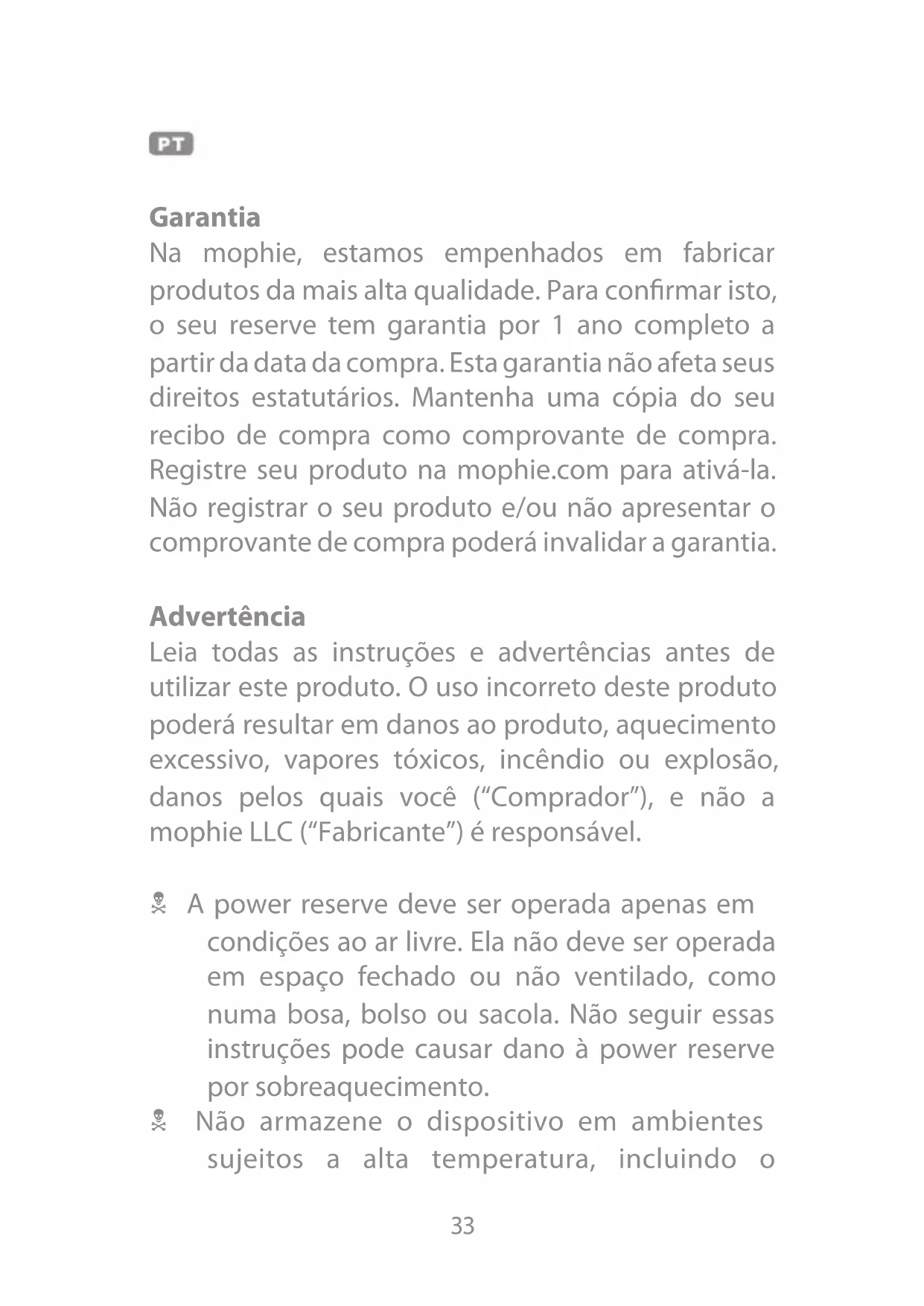 A power reserve deve ser operada apenas em condições ao ar livre. Ela não deve ser operada em espaço fechado ou não ventilado, como numa bosa, bolso ou sacola. Não seguir estas instruções pode causar dano à power reserve por sobraquecimento.