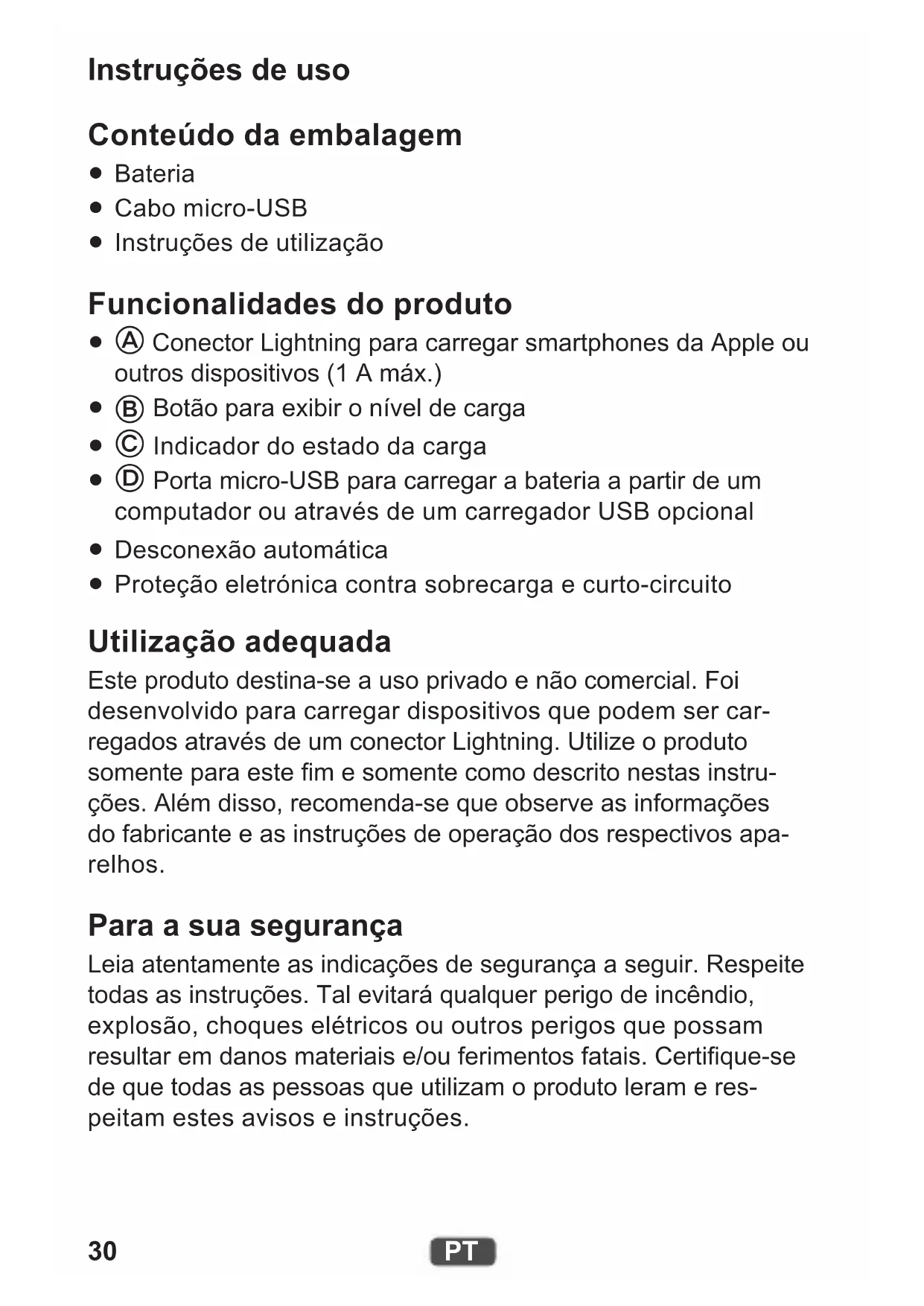 Proteção eletrónica contra sobrecarga e curto-circuito Utilização adequada Este produto destina-se a uso privado e não comercial. Foi desenvolvido para carregar dispositivos que podem ser car- regados através de um conector Lightning. Utilize o produto somente para este m e somente como descrito nestas instru- ções. Além disso, recomenda-se que observe as informações do fabricante e as instruções de operação dos respectivos apa- relhos. Para a sua segurança Leia atentamente as indicações de segurança a seguir. Respeite todas as instruções. Tal evitará qualquer perigo de incêndio, explosão, choques elétricos ou outros perigos que possam resultar em danos materiais e/ou ferimentos fatais. Certique-se de que todas as pessoas que utilizam o produto leram e res- peitam estes avisos e instruções.31