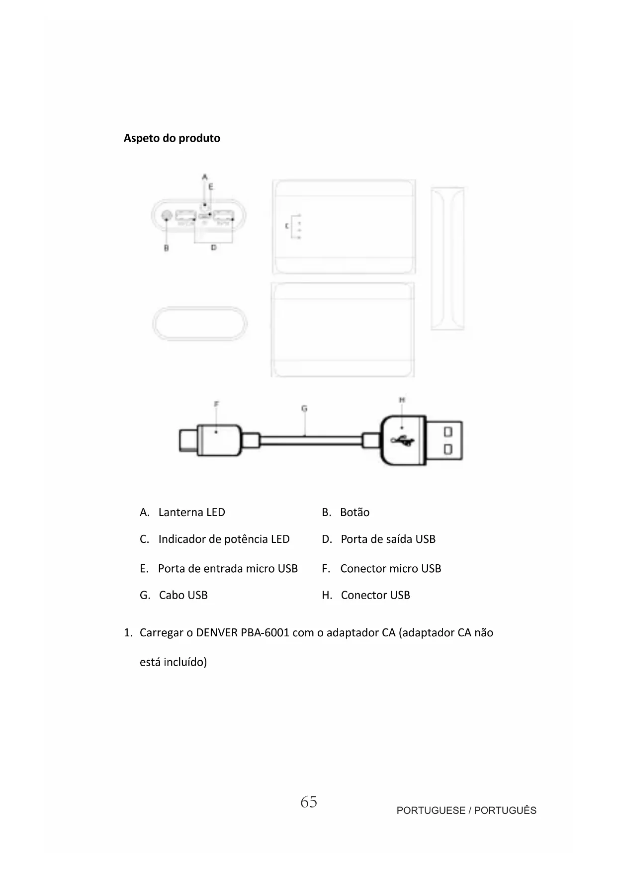 - Usar o cabo original do produto digital e ligar um dos terminais ao produto digital e o除外 terminal ao DENVER PBA-6001. Se o indicator da bateria (indicador de sina'da) acender, significa que o processo de correamento ja se iniciou. quando todos os indicadores acenderem, significa que o produto digital está totalmente carregado.