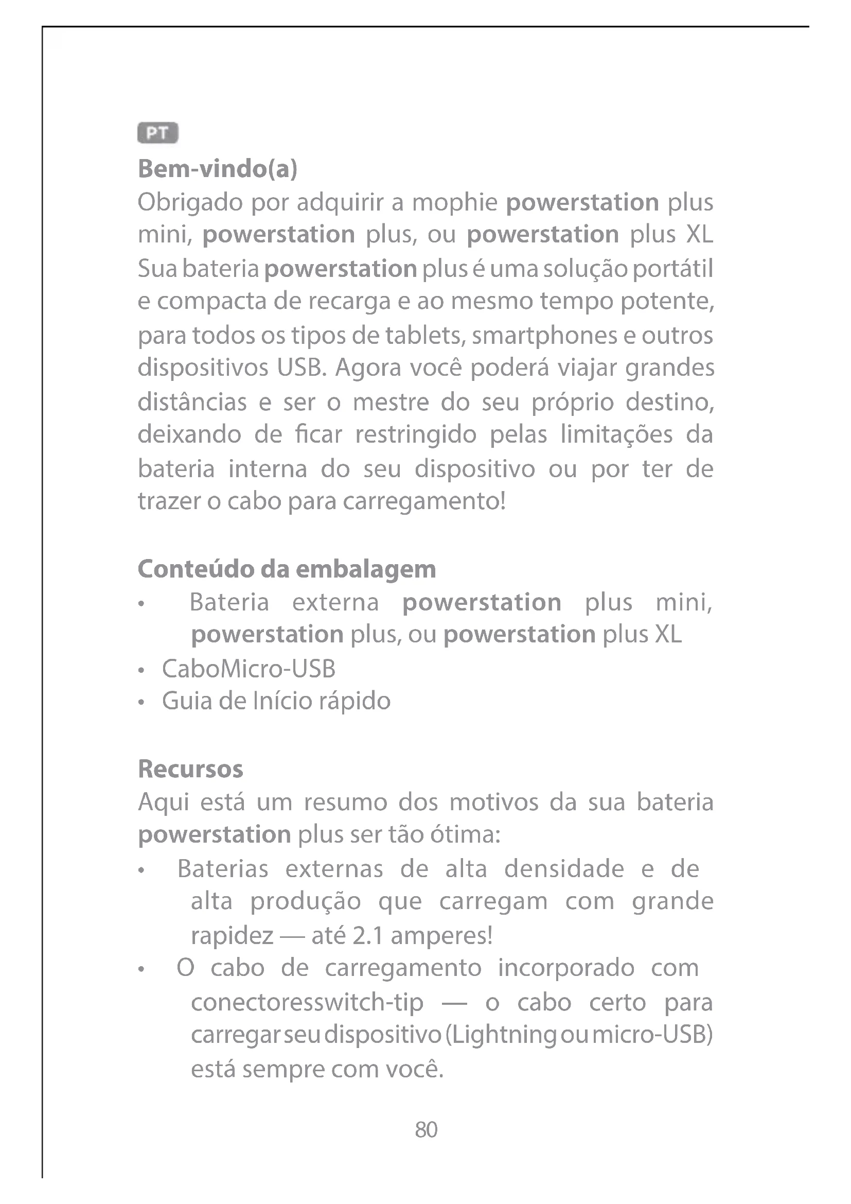 Obrigado por adquirir a mophie powerstation plus mini, powerstation plus, ou powerstation plus XL Sua bateria powerstation plus é uma solução portátil e compacta de recarga e ao mesmo tempo potente, para todos os tipos de tablets, smartphones e outros dispositivos USB. Agora você poderá viajar grandes distâncias e ser o mestre do seu próprio destino, deixando de ficar restringido pelas limitações da bateria interna do seu dispositivo ou por ter de trazer o cabo para carregamento!