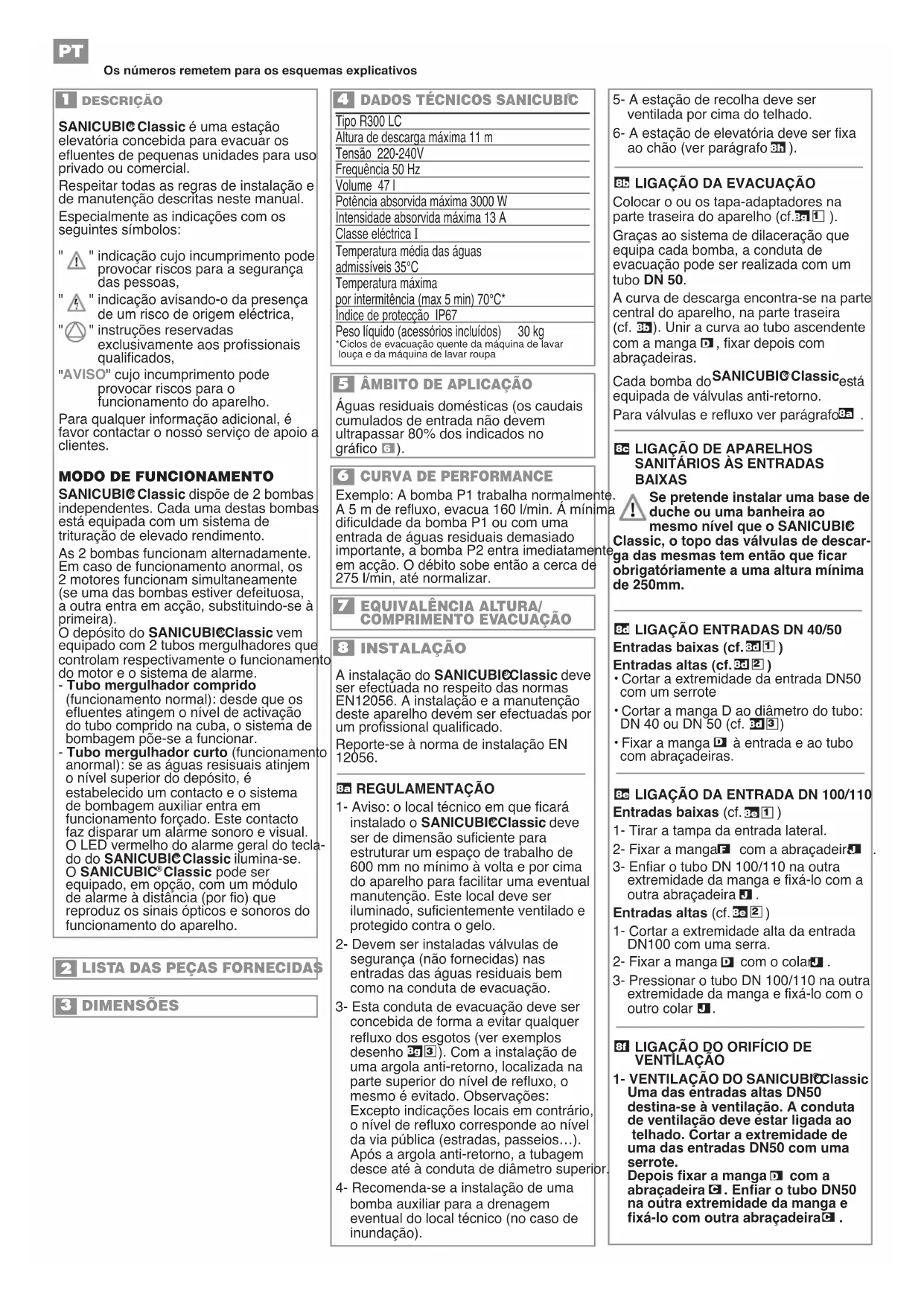 Classic é uma estação elevatória concebida para evacuar os efluentes de pequenas unidades para uso privado ou comercial. Respeitar todas as regras de instalação e de manutenção descritas neste manual. Especialmente as indicações com os seguintes símbolos: " " indicação cujo incumprimento pode provocar riscos para a segurança das pessoas, " " indicação avisando-o da presença de um risco de origem eléctrica, " " instruções reservadas exclusivamente aos profissionais qualificados,