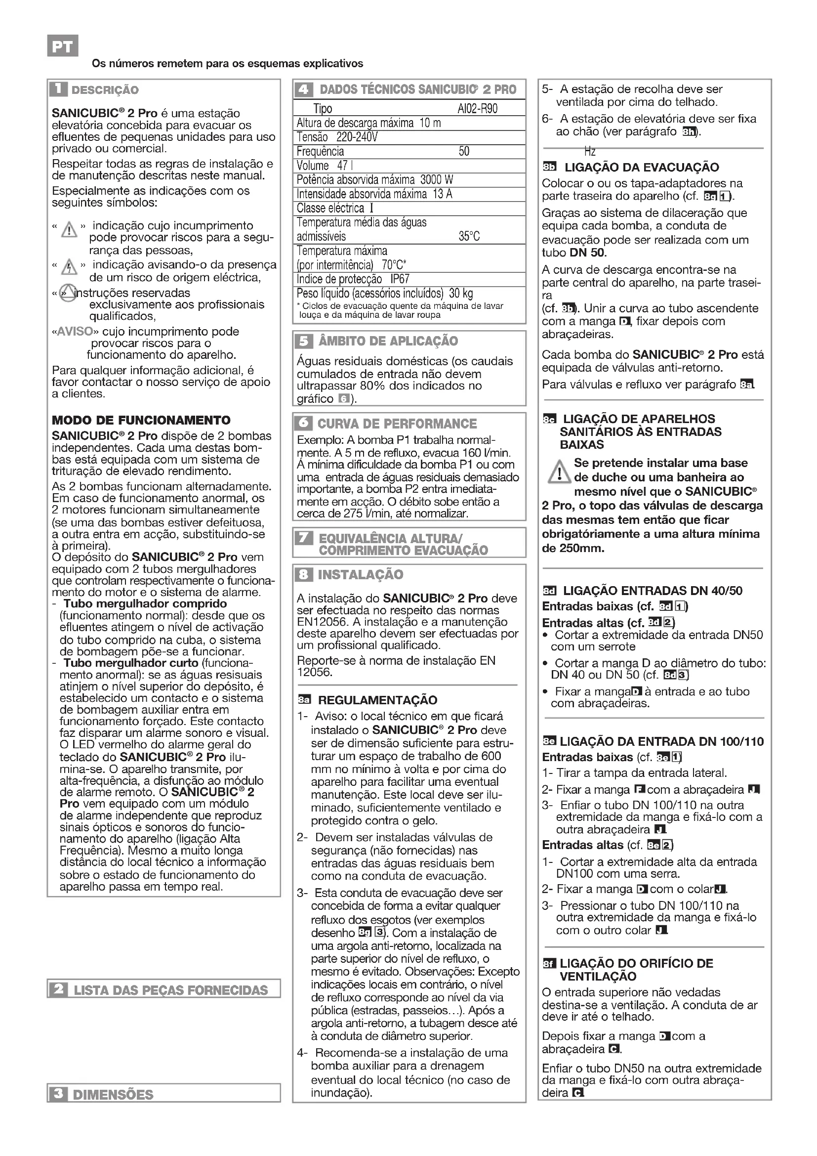 2 Pro é uma estação elevatória concebida para evacuar os efluentes de pequenas unidades para uso privado ou comercial. Respeitar todas as regras de instalação e de manutenção descritas neste manual. Especialmente as indicações com os seguintes símbolos:
