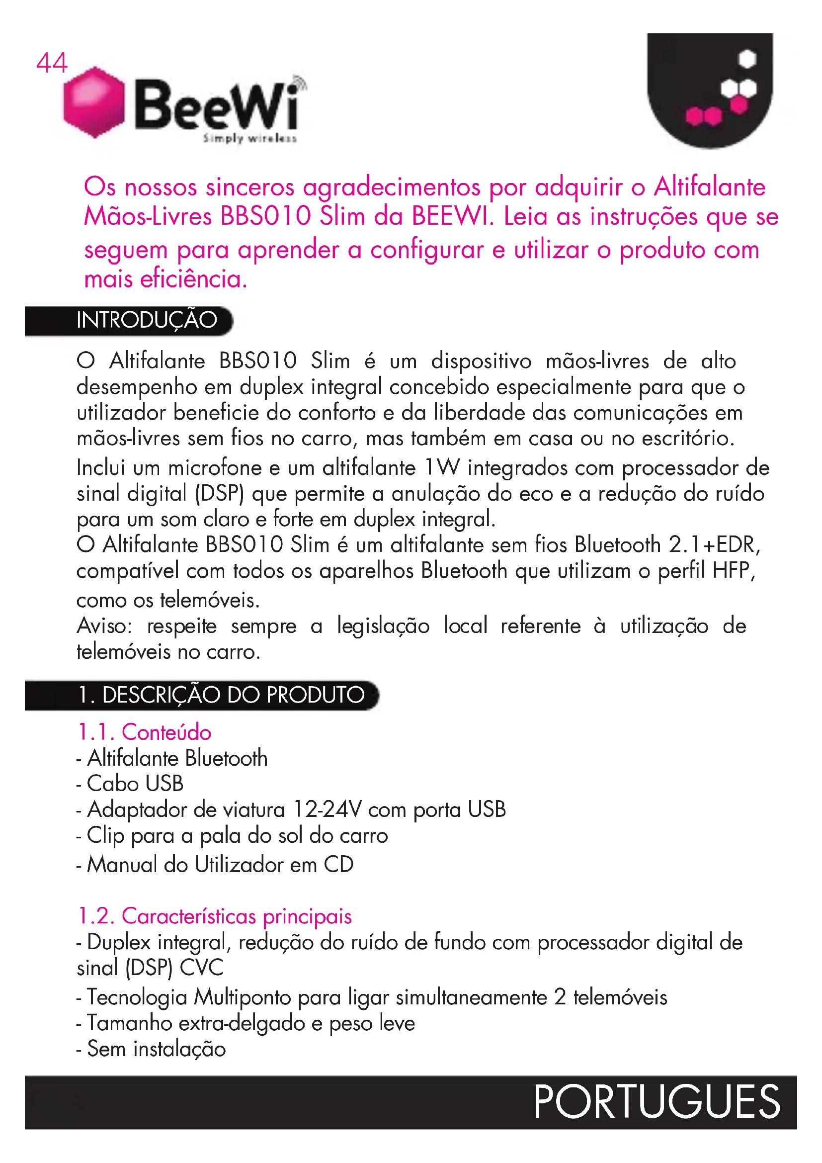 PORTUGUES45 - Até 1000 horas de funcionamento em standby e 5 horas contínuas de conversação em condições normais. 1.3. Apresentação do produto - (1) Altifalante - (2) Microfone - (3) Indicador LED - (4) Tomada de carga (Micro-USB) - (5) Botão multifunções (MFB) - (6) Volume Cima (V+) e Baixo (V-) 1.4. Especificações do produto Especificação Bluetooth Bluetooth V2.1+EDR Perfis Bluetooth HSP – HFP1.5 Banda de frequências 2.4GHz~2.48 GHz ISM Band Classe e alcance da potência Classe 2, até 10 metros Número de aparelhos acoplados Até 8 aparelhos Potência de saída áudio máxima 1W Autonomia em standby Até 1000 horas (40 dias) Autonomia em conversação Até 5 horas Bateria Bateria recarregável de lítio-polímero de 340mAH Tempo de carga da bateria Até 2 horas Dimensões 100C x 48L x 8P mm Peso 42 g PORTUGUES46 2.1. Instalar na viatura Insira o clip de metal na parte de trás do altifalante e fixe-o à pala do sol do condutor. Certifique-se de que o altifalante está firmemente fixado, com o microfone a apontar na direcção do condutor. 2.2. Carregar Antes de utilizar o altifalante pela primeira vez, é aconselhável carregar a bateria na íntegra. O tempo normal de carga é de cerca de 2 horas. O LED vermelho mantém-se aceso durante a carga e desliga-se logo que a carga fica completa. IMPORTANTE: - O indicador de carga não se acende de imediato no caso em que o altifalante não é utilizado após um longo período de tempo ou a bateria está esgotada. - Para prolongar a duração útil da bateria, é preferível carregar o altifalante logo que aparece o indicador de bateria fraca. 2.3. Ligar / desligar Ligar: prima e mantenha premido o botão MFB durante 3 segundos até ouvir um bip curto. O LED azul intermitente acende-se e o altifalante liga- se automaticamente ao telemóvel ao qual foi previamente acoplado. Desligar: prima e mantenha premido o botão MFB durante 3 segundos até ouvir um bip curto. O LED vermelho intermitente desliga-se de imediato. 2.4. Acoplar e ligar Consulte os procedimentos de acoplamento Bluetooth no manual do utilizador do telemóvel. Com o altifalante desligado, prima longamente o botão MFB durante cerca de 5 segundos até o indicador luminoso piscar uma luz vermelha e azul de forma alternada. De seguida, solte o botão. A luz intermitente alternada indica que o altifalante está no modo de acoplamento. Procure os periféricos Bluetooth no telefone e seleccione “BeeWi BBS010” no ecrã. Introduza o código de acoplamento “0000” para adicionar o altifalante à lista dos aparelhos acoplados. Depois de o acoplamento ser