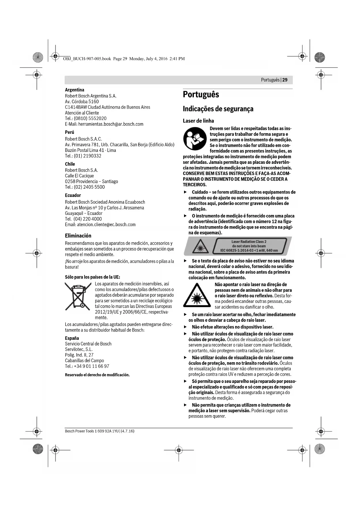 OBJ_BUCH-907-005.book Page 33 Monday, July 4, 2016 2:41 PM34 | Português 1 609 92A 1YU | (4.7.16) Bosch Power Tools Exemplo: no caso de um vão da porte com uma altura de 2 m, a divergência deve ser de no máximo 2x2m x±0,2mm/m =±0,8mm. Entre os pontos III e IV só deve portanto haver uma distância de no máximo 0,8 mm. Indicações de trabalho Para marcar, só deve ser utilizado o centro da linha de la- ser. A largura da linha de laser modifica-se com a distância. Trabalhar com a placa-alvo de laser A placa-alvo de laser 15 melhora a visibilidade do raio laser em condições desfavoráveis e a maiores distâncias. A metade da placa-alvo de laser 15 refletora melhora a visibi- lidade da linha de laser, e devido à metade transparente, a li- nha de laser também pode ser vista pelo lado de trás da placa- alvo de laser. Trabalhar com o tripé (acessório) O tripé é um suporte de medição estável e com altura regulável. Colocar o instrumento de medição com a admissão de tripé de 1/4" 9 sobre a rosca do tripé 22 ou sobre um tripé de fotografia de tipo comercial. Para a fixação num tripé de tipo comercial deverá usar uma fixação de tripé de 5/8" 8. Aparafusar o instru- mento de medição com o parafuso de fixação do tripé. Fixar com o suporte universal (acessório) (veja figura D) Com ajuda do suporte universal 19 é possível fixar o instru- mento de medição, p.ex. em superfícies e tubos verticais ou em materiais magnéticos. O suporte universal també m é apropriado como tripé de chão e facilita o alinhamento de altura do instrumento de medição. Trabalhar com a placa de medição (acessório) (vejafigurasA–B) Com a placa de medição 16 é possível transferir a marcação de laser para o chão ou a altura do laser para uma parede. Com o campo nulo e com a escala é possível marcar o deslo- camento em relação à altura desejada e transferir para um ou- tro local. Desta forma não é mais necessário ajustar o instru- mento de medição exatamente à altura a ser transferida. A placa de medição 16 possui uma camada de reflexão, que melhora a visibilidade do raio laser em maiores distâncias ou a forte incidência de raios solares. A intensificação da clarida- de só pode ser reconhecida, se olhar para a placa de medição, paralelamente ao raio laser. Trabalhar com recetor de laser (acessório) (veja figura D) Sob condições de iluminação desfavoráveis (ambiente claro, raios solares diretos) e maiores distâncias, deverá usar um re- cetor de laser 17 para encontrar as linhas de laser com maior facilidade. Ligar a função de pulsação para trabalhar com o re- cetor de laser (veja “Função de pulsação”, página 32). Óculos para visualização de raio laser (acessório) Os óculos de visualização de raio laser filtram a luz ambiente. Com isto a luz vermelha do laser parece mais clara para os olhos. Não utilizar óculos de visualização de raio laser como óculos de proteção. Óculos de visualização de raio laser servem para reconhecer o raio laser com maior facilidade, e portanto, não protegem contra radiação laser. Não utilizar óculos de visualização de raio laser como óculos de proteção, nem no trânsito rodoviário. Óculos de visualização de raio laser não oferecem uma completa proteção contra raios UV e reduzem a perceção de cores. Exemplos de trabalhos (veja figuras C–H) Nas páginas de gráficos encontram-se exemplos das diversas aplicações do instrumento de medição. Manutenção e serviço Manutenção e limpeza Só armazenar e transportar o instrumento de medição na bol- sa de proteção fornecida. Manter o instrumento de medição sempre limpo. Não mergulhar o instrumento de medição na água ou em ou- tros líquidos. Limpar sujidades com um pano húmido e macio. Não utilizar produtos de limpeza nem solventes. Limpar regularmente, em especial, as superfícies em volta da abertura de saída do laser e verificar que não hajam pelos. Em caso de reparações, enviar o instrumento de medição dentro da bolsa de proteção 18. Serviço pós-venda e consultoria de aplicação O serviço pós-venda responde às suas perguntas a respeito de serviços de reparação e de manutenção do seu produto, assim como das peças sobressalentes. Desenhos explodidos e informações sobre peças sobressalentes encontram-se em: www.bosch-pt.com A nossa equipa de consultoria de aplicação Bosch esclarece com prazer todas as suas dúvidas a respeito da compra, apli- cação e ajuste dos produtos e acessórios. Indique para todas as questões e encomendas de peças so- bressalentes a referência de 10 dígitos de acordo com a placa de caraterísticas do produto. Portugal Robert Bosch LDA Avenida Infante D. Henrique Lotes 2E – 3E 1800 Lisboa Para efetuar o seu pedido online de peças entre na página www.ferramentasbosch.com. Tel.: 21 8500000 Fax: 21 8511096 Brasil Robert Bosch Ltda. Caixa postal 1195 13065-900 Campinas Tel.: (0800) 7045446 www.bosch.com.br/contacto Eliminação Instrumentos de medição, acessórios e embalagens devem ser enviados a uma reciclagem ecológica de matéria-prima. Não deitar os instrumentos de medição e acumuladores/ pilhas no lixo doméstico! OBJ_BUCH-907-005.book Page 34 Monday, July 4, 2016 2:41 PMItaliano | 35 Bosch Power Tools 1 609 92A 1YU | (4.7.16) Apenas países da União Europeia: Conforme as Diretivas Europeias 2012/19/UE relativa aos resíduos de instru- mentos de medição europeias 2006/66/CE é necessário recolher separadamente os acumuladores/as pilhas defeituosos ou gastos e conduzi-los a uma reciclagem ecológica. Sob reserva de alterações. Italiano Norme di sicurezza Livella a raggi laser Leggere e osservare tutte le avvertenze e le istruzioni, per lavorare con lo strumento di misura in modo sicuro e senza pericoli. Se lo strumento di misura non verrà utilizzato conformemente alle seguenti istruzioni, ciò potrà pregiudicare gli accorgimenti di protezio