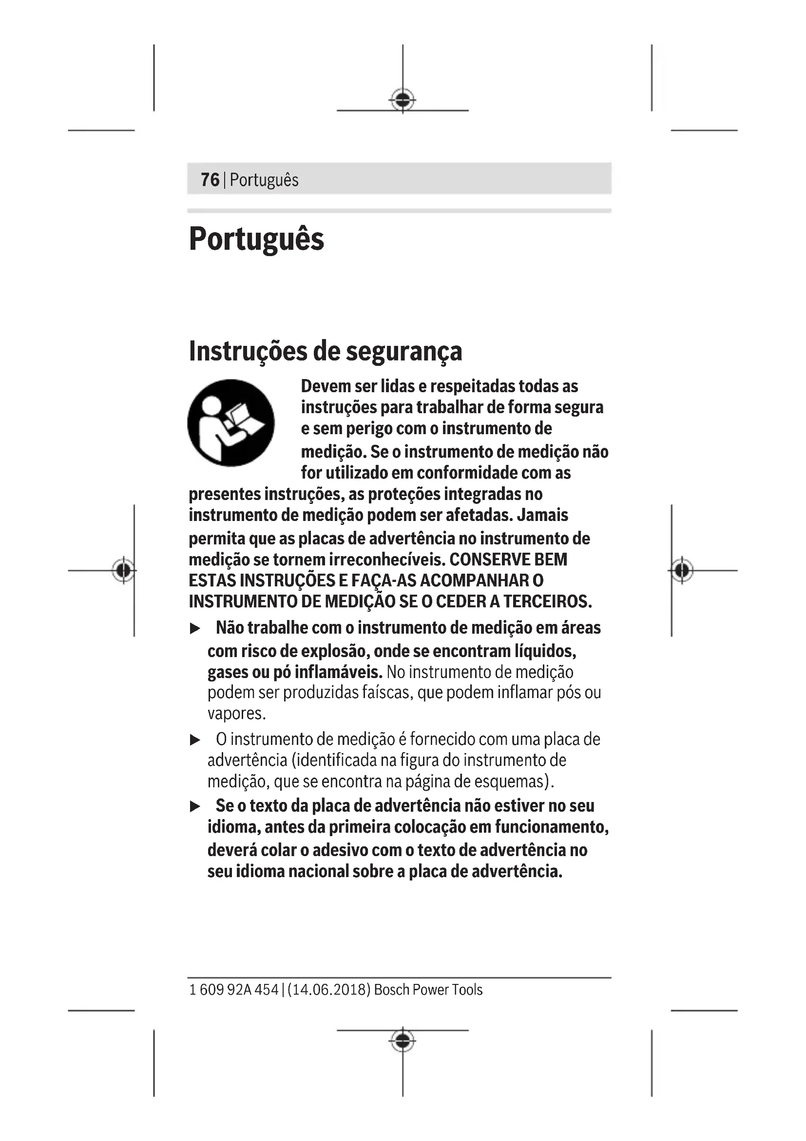 consoante a qualidade da superfície e as condições ambientais Medidor laser de distâncias digital Colocar/trocar pilhas Para a operação do instrumento de medição, é recomendável utilizar pilhas de mangano alcalino. – Coloque as pilhas (ver figura na página 4). Tenha atenção à polaridade correta de acordo com a representação no interior do compartimento das pilhas. Se a tensão da pilha começar a enfraquecer é exibido o aviso de pilha (a) no mostrador. Quando o símbolo de pilha surgir no mostrador pela primeira vez, ainda é possível realizar medições pelo menos durante aprox. 15minutos. Quando o símbolo das pilhaspiscar, terá de substituir as pilhas, deixando de ser possível realizar medições. Substitua sempre todas as pilhas em simultâneo. Utilize apenas pilhas de um fabricante e com a mesma capacidade. u Não use baterias ou pilhas de lítio. O instrumento de medição pode ser danificado. Funcionamento Ligar/desligar medidor laser de distâncias – Para ligar o instrumento de medição, prima demoradamente a tecla de medição (1). Ao ligar o instrumento de medição, o raio laser é ligado. A indicação pisca no mostrador. – Para desligar o instrumento de medição mantenha premida a tecla de medição (1). Processo de medição Depois de ligar o instrumento de medição, é efetuada uma medição contínua. O valor de medição atual (g) é indicado na linha inferior do mostrador (ver figura A). Durante a medição contínua é possível deslocar o instrumento de medição relativamente ao alvo, sendo que o valor de medição atual (g) é atualizado aprox. a cada 0,5 segundos na linha inferior do mostrador (ver a figura B). A indicação pisca no mostrador. O nível de referência para a medição é o rebordo traseiro do instrumento de medição ( ). (ver figura C) Medição de comprimentos – Prima a tecla de medição (1) para parar a medição. O raio laser é desligado e é exibido o valor de medição atual (g). – Volte a premir a tecla de medição (1), para voltar a ligar o laser e continuar a medição. O valor de medição atual (g) é indicado na linha inferior do mostrador, o valor de medição anterior (e) é indicado por cima. Português | 83 Bosch Power Tools 1 609 92A 454 | (14.06.2018)84 | Português 1 609 92A 454 | (14.06.2018) Bosch Power Tools Medição de áreas – Prima duas vezes rapidamente a tecla de medição (1), para multiplicar os últimos dois valores de medição (ver figura D). No mostrador surge a indicação , é indicado o valor de área. Prima novamente duas vezes rapidamente a tecla de medição (1), para aceder à indicação dos últimos dois valores de medição. Se não for premida nenhuma tecla no instrumento de medição durante aprox. 5minutos, o instrumento de medição desliga- se automaticamente para efeitos de economia das pilhas. u Não apontar o raio de laser na direção de pessoas nem de animais e não olhar no raio laser, nem mesmo de maiores distâncias. Instruções de trabalho Indicações gerais A lente recetora (7) e a saída do raio laser (8) não podem ser tapados durante a medição. A medição é realizada no centro do raio laser, mesmo quando as superfícies são visualizadas obliquamente. Erros – Causas e soluções Causa Solução Monitorização da temperatura (b) pisca, indicação "err", medição não possível, o instrumento de medição desliga-se automaticamente após 5 segundos O instrumento de medição está fora da gama de temperaturas de funcionamento de –10 °C a +40 °C. Espere até que o instrumento de medição alcance a temperatura de serviço. Depois volte a ligar o instrumento de medição. Todos os símbolos piscam, medição não possívelCausa Solução Instrumento de medição com defeito Verifique as pilhas e substitua-as se necessário. Adaptador montado (c) pisca, indicação "err", medição não possível Erro de adaptador: – Adaptador com defeito Envie o adaptador para o Serviço de Assistência Técnica. – O adaptador não tem ligação com o instrumento de medição Limpe os contatos. Se o adaptador continuar a não estabelecer uma ligação com o instrumento de medição, envie o adaptador para o Serviço de Assistência Técnica. Indicação "----", medição não possível Amplitude de medição excedida (20 m)