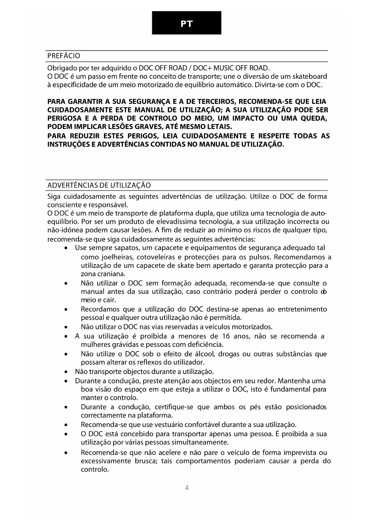 PREFÁCIO Obrigado por ter adquirido o DOC OFF ROAD / DOC+ MUSIC OFF ROAD. O DOC é um passo em frente no conceito de transporte; une o diversão de um skateboard à especificidade de um meio motorizado de equilíbrio automático. Divirta-se com o DOC.