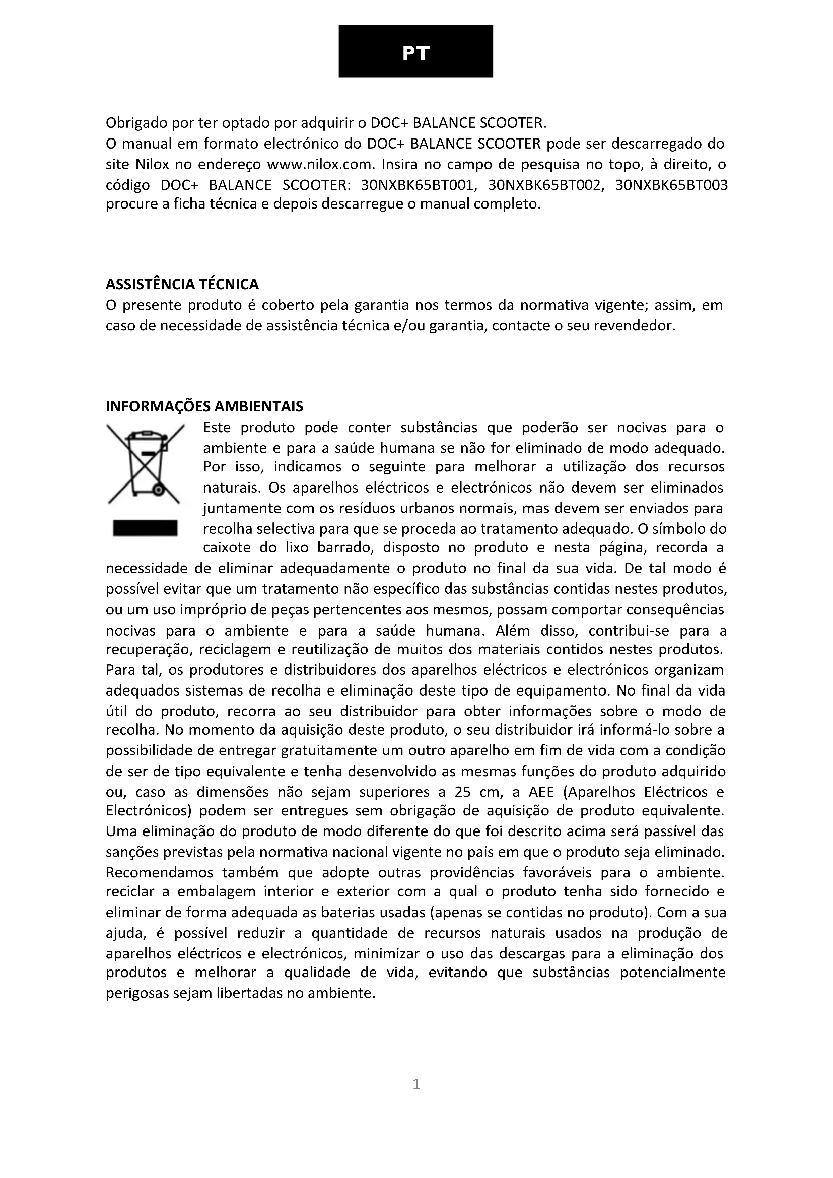 Obrigado por ter optado por adquirir o DOC+ BALANCE SCOOTER. O manual em formato electrónico do DOC+ BALANCE SCOOTER pode ser descarregado do site Nilox no endereço www.nilox.com. Insira no campo de pesquisa no topo, à direito, o código DOC+ BALANCE SCOOTER: 30NXBK65BT001, 30NXBK65BT002, 30NXBK65BT003 procure a ficha técnica e depois descarregue o manual completo.