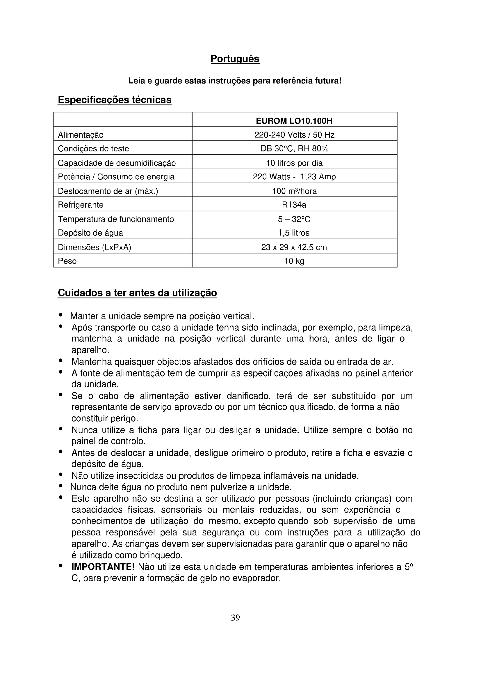 LO10.100H - Desumidificador Euromac - Manual de utilização gratuito