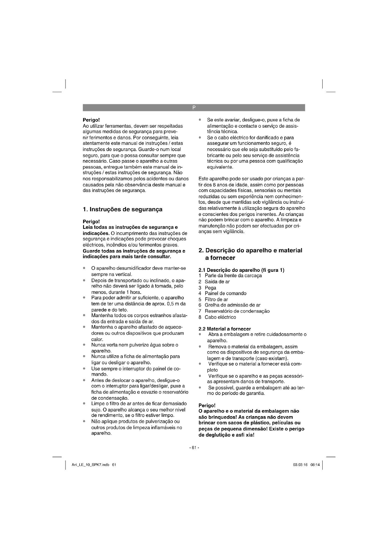 Se possível, guarde a embalagem até ao ter- mo do período de garantia. Perigo! O aparelho e o material da embalagem não são brinquedos! As crianças não devem brincar com sacos de plástico, películas ou peças de pequena dimensão! Existe o perigo de deglutição e asfi xia! Anl_LE_10_SPK7.indb 61Anl_LE_10_SPK7.indb 61 03.03.16 08:1403.03.16 08:14P