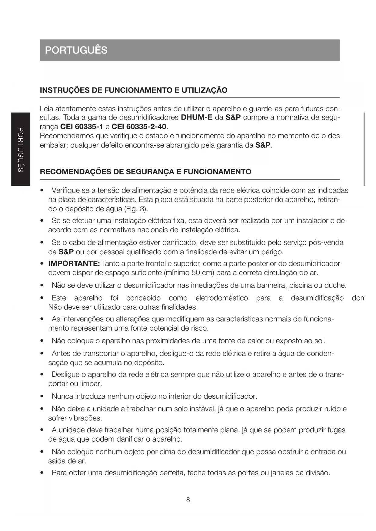 Leia atentamente estas instruções antes de utilizar o aparelho e guarde-as para futuras consultas. Toda a gama de desumidificadores DHUM-E da S&P cumpre a normativa de segurança CEI 60335-1 e CEI 60335-2-40.