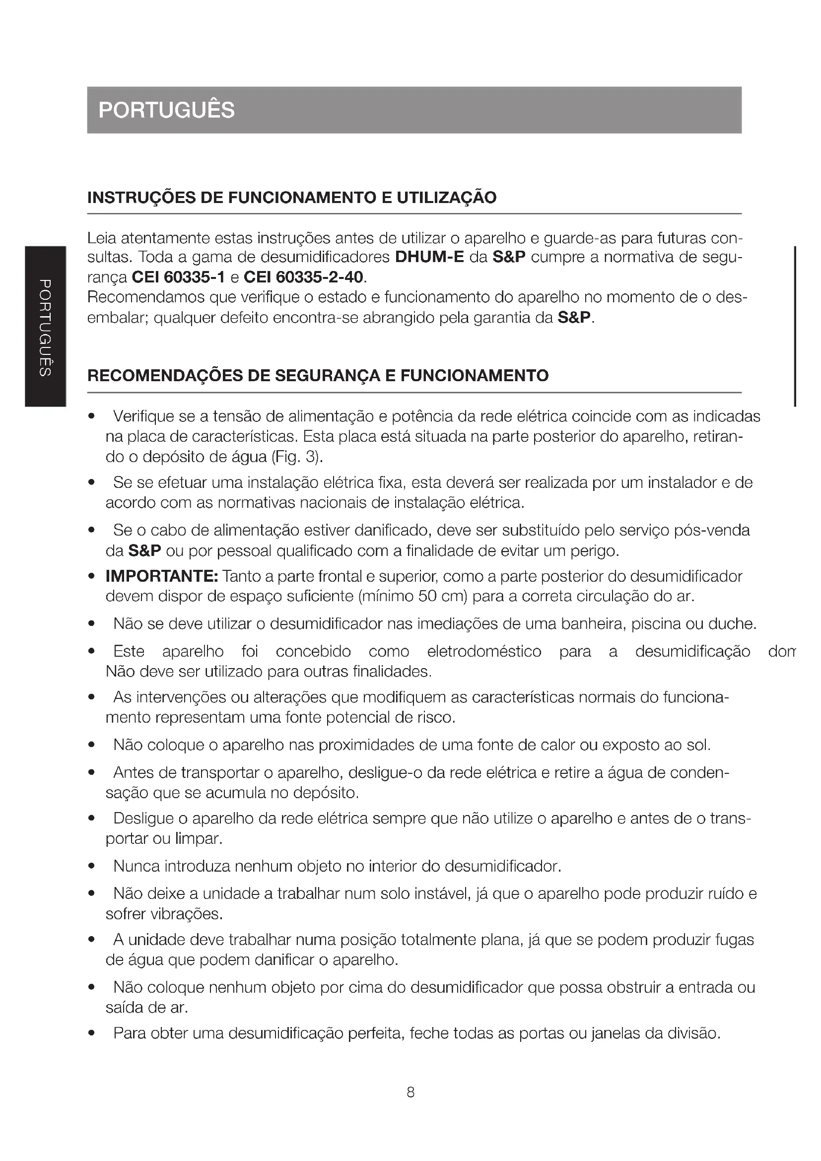 - Este aparelho foi concebido como eletrodoméstico para a desumidicação doméstica. Nãodeveserutilizadoparaoutrasnalidades.