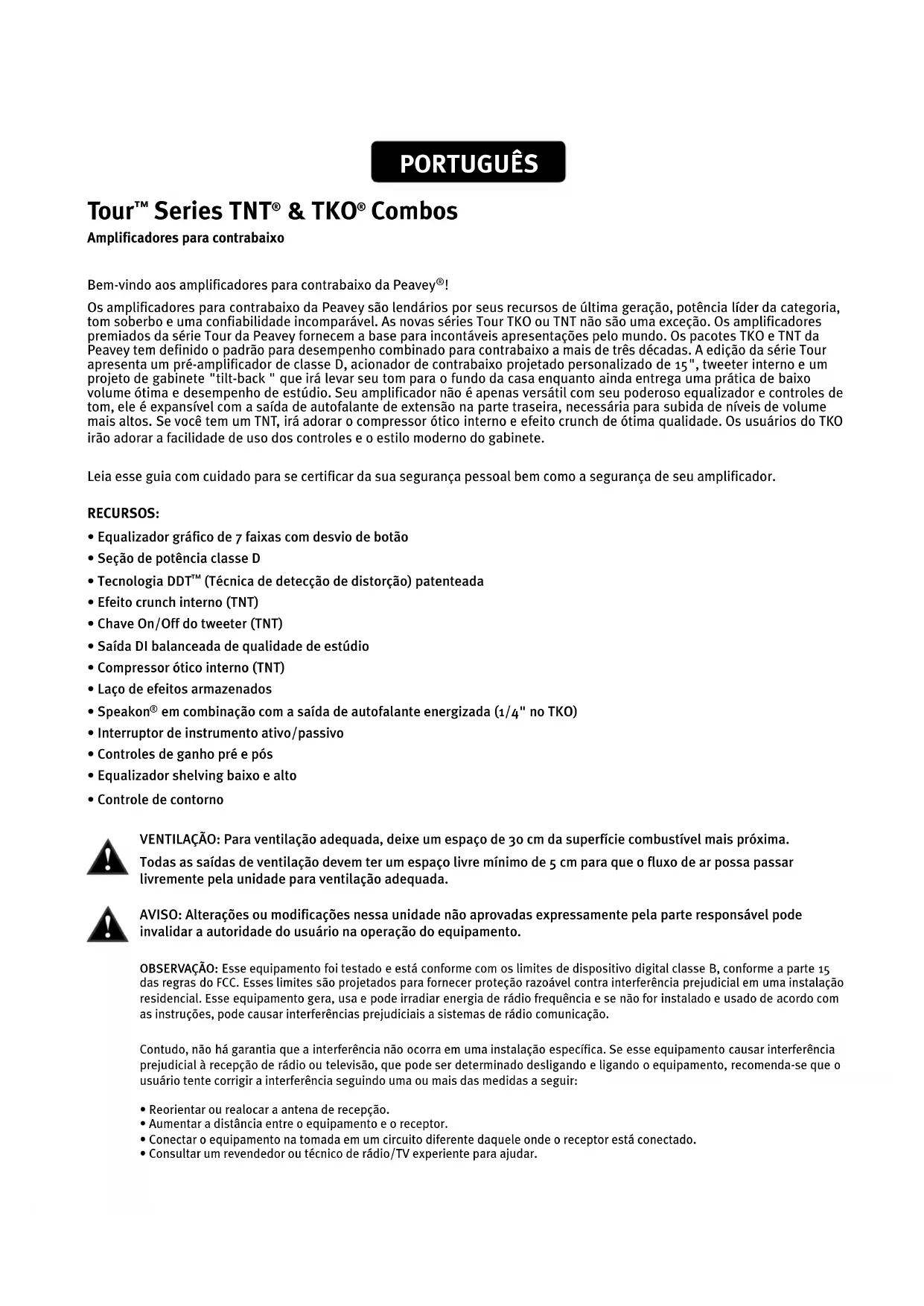 Os amplificadores para contrabaixo da Peavey são lendários por seus recursos de última geração, potência líder da categoria, tom soberbo e uma confiabilidade incomparável. As novas séries Tour TKO ou TNT não são uma exceção. Os amplificadores premiados da série Tour da Peavey fornecem a base para incontáveis apresentações pelo mundo. Os pacotes TKO e TNT da Peavey tem definido o padrão para desempenho combinado para contrabaixo a mais de três décadas. A edição da série Tour apresenta um pré-amplificador de classe D, acionador de contrabaixo projetado personalizado de 15", tweeter interno e um projeto de gabinete "tilt-back " que irá levar seu tom para o fundo da casa enquanto ainda entrega uma prática de baixo volume ótima e desempenho de estúdio. Seu amplificador não é apenas versátil com seu poderoso equalizador e controles de tom, ele é expansível com a saída de autofalante de extensão na parte traseira, necessária para subida de níveis de volume mais altos. Se você tem um TNT, irá adorar o compressor ótico interno e efeito crunch de ótima qualidade. Os usuários do TKO irão adorar a facilidade de uso dos controles e o estilo moderno do gabinete. Leia esse guia com cuidado para se certificar da sua segurança pessoal bem como a segurança de seu amplificador. RECURSOS: