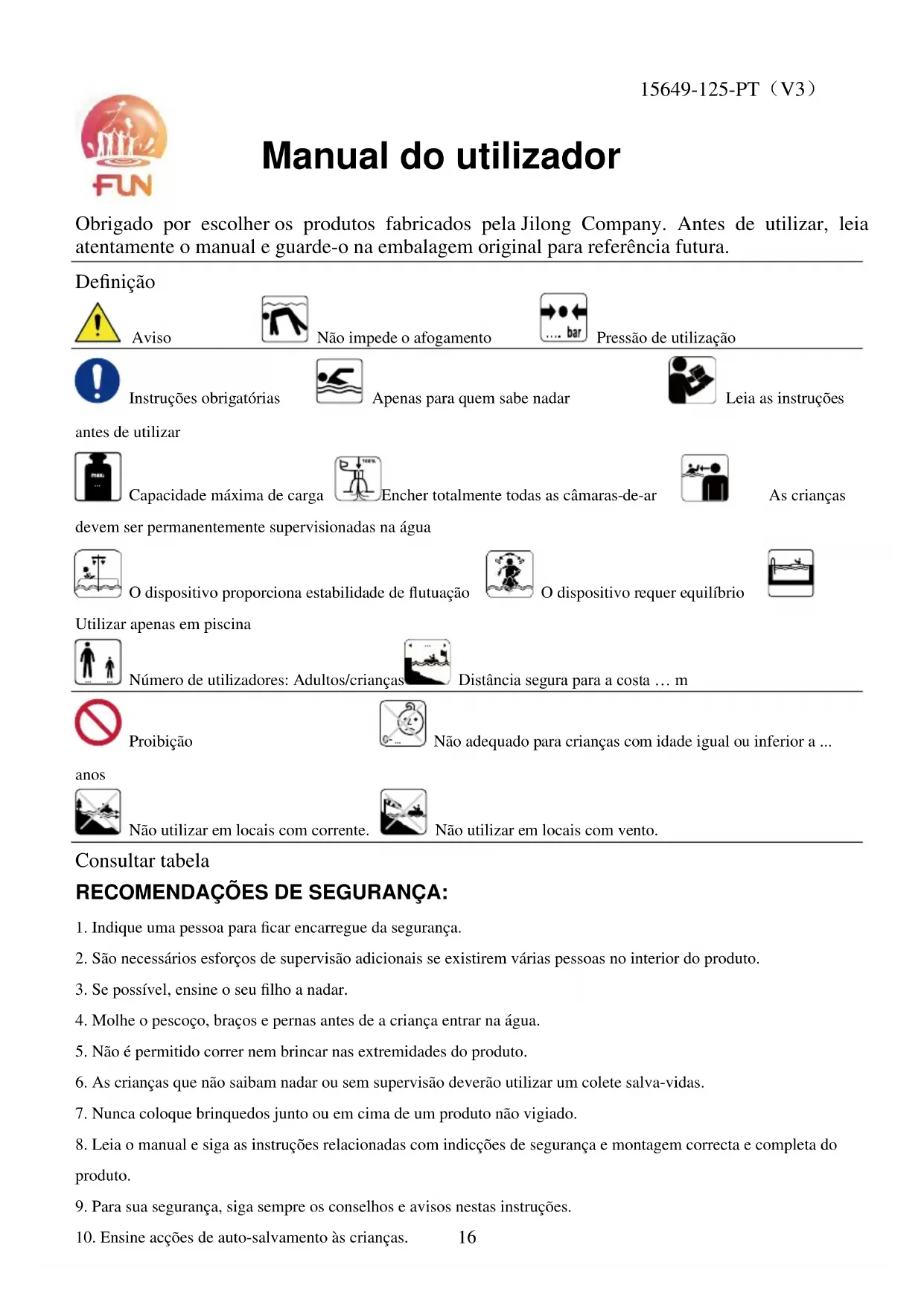 Obrigado por escolher os produtos fabricados pela Jilong Company. Antes de utilizar, leia atentamente o manual e guarde-o na embalagem original para referência futura. Definição Aviso Não impede o afogamento Pressão de utilização Instruções obrigatórias Apenas para quem sabe nadar Leia as instruções antes de utilizar Capacidade máxima de carga Encher totalmente todas as câmaras-de-ar As crianças devem ser permanentemente supervisionadas na água O dispositivo proporciona estabilidade de flutuação O dispositivo requer equilíbrio Utilizar apenas em piscina Número de utilizadores: Adultos/crianças Distância segura para a costa … m Proibição Não adequado para crianças com idade igual ou inferior a ... anos Não utilizar em locais com corrente. Não utilizar em locais com vento. Consultar tabela RECOMENDAÇÕES DE SEGURANÇA: 1. Indique uma pessoa para ficar encarregue da segurança. 2. São necessários esforços de supervisão adicionais se existirem várias pessoas no interior do produto. 3. Se possível, ensine o seu filho a nadar. 4. Molhe o pescoço, braços e pernas antes de a criança entrar na água. 5. Não é permitido correr nem brincar nas extremidades do produto. 6. As crianças que não saibam nadar ou sem supervisão deverão utilizar um colete salva-vidas. 7. Nunca coloque brinquedos junto ou em cima de um produto não vigiado. 8. Leia o manual e siga as instruções relacionadas com indicções de segurança e montagem correcta e completa do produto. 9. Para sua segurança, siga sempre os conselhos e avisos nestas instruções. 10. Ensine acções de auto-salvamento às crianças. 15649-125-PT(V2) Manual do utilizador 15649-125-PT(V3)17