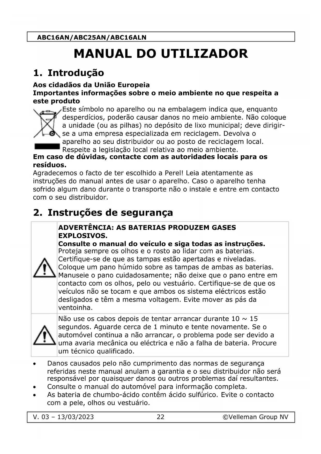 Utilize este aparelho apenas com acessórios originais. A Velleman Group NV não será responsável por quaisquer danos ou lesões causados pelo uso (indevido) do aparelho. Para mais informação sobre este produto e para aceder à versão mais recente deste manual do utilizador, visite a nossa página www.perel.eu. Podem alterar-se as especificações e o conteúdo deste manual sem aviso prévio.