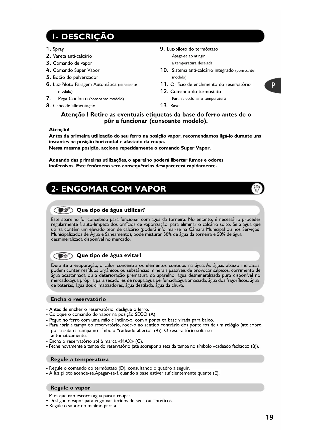 Que tipo de água utilizar? Este aparelho foi concebido para funcionar com água da torneira. No entanto, é necessário procederregularmente à auto-limpeza dos orifícios de vaporização, para eliminar o calcário solto. Se a água que utiliza contém um elevado teor de calcário (poderá informar-se na Câmara Municipal ou nos Serviços Municipalizados de Água e Saneamento), pode misturar 50% de água da torneira e 50% de água desmineralizada disponível no mercado. Que tipo de água evitar? Durante a evaporação, o calor concentra os elementos contidos na água. As águas abaixo indicadas podem conter resíduos orgânicos ou substâncias minerais passíveis de provocar salpicos, corrimento deágua acastanhada ou a deterioração prematura do aparelho: água desmineralizada pura disponível nomercado,água própria para secadores de roupa,água perfumada,água amaciada, água dos frigoríficos, águade baterias, água dos climatizadores, água destilada, água da chuva.Atenção!Antes da primeira utilização do seu ferro na posição vapor, recomendamos ligá-lo durante unsinstantes na posição horizontal e afastado da roupa.Nessa mesma posição, accione repetidamente o comando Super Vapor. Aquando das primeiras utilizações, o aparelho poderá libertar fumos e odores inofensivos. Este fenómeno sem consequências desaparecerá rapidamente. Atenção ! Retire as eventuais etiquetas da base do ferro antes de o pôr a funcionar (consoante modelo).