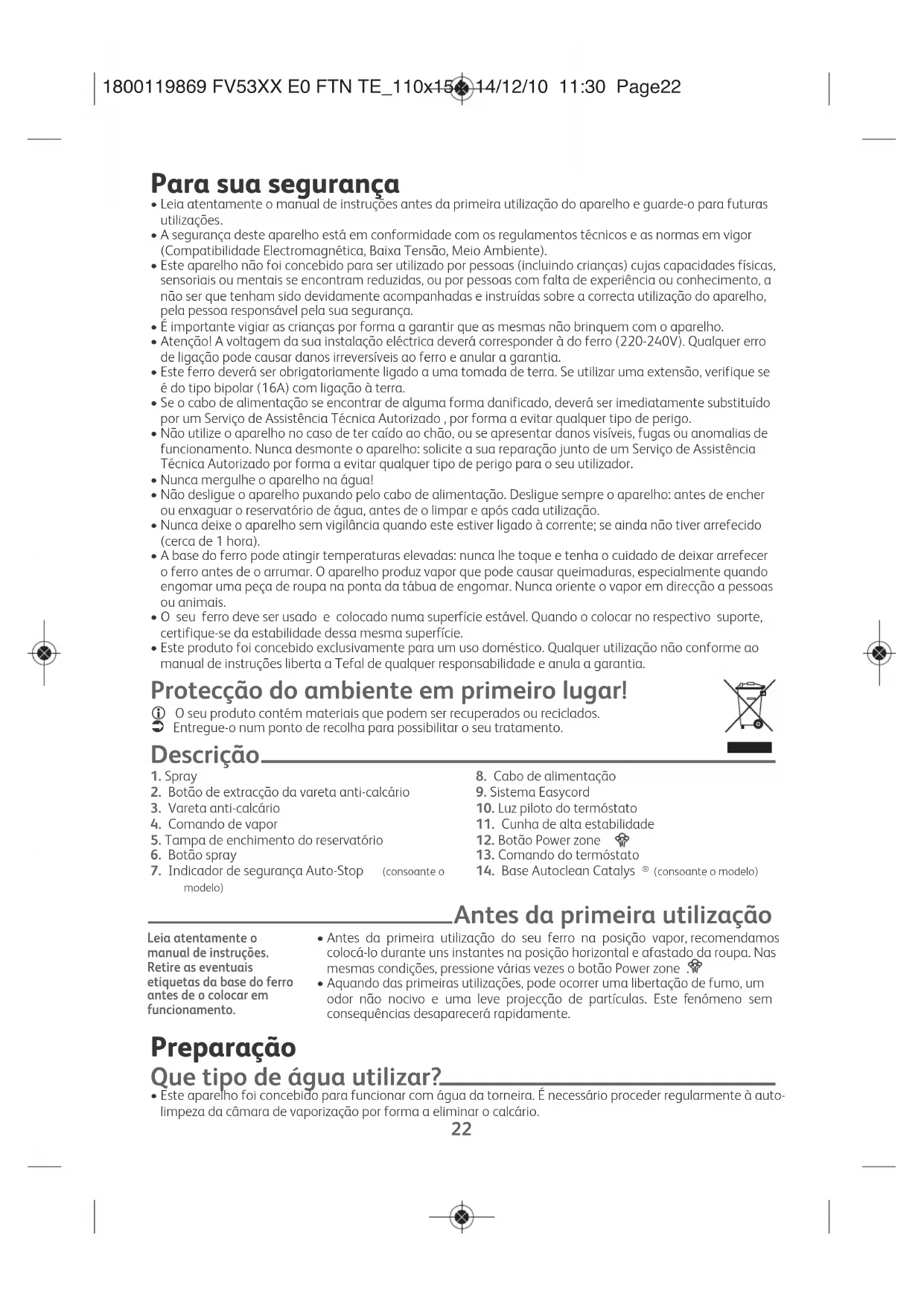 - Este aparelho foi concebido para funcionar com água da torneira. É necessário proceder regularmente à auto- limpeza da câmara de vaporização por forma a eliminar o calcário. Leia atentamente o manual de instruções. Retire as eventuais etiquetas da base do ferro antes de o colocar em funcionamento. 1800119869 FV53XX E0 FTN TE_110x154 14/12/10 11:30 Page22EN