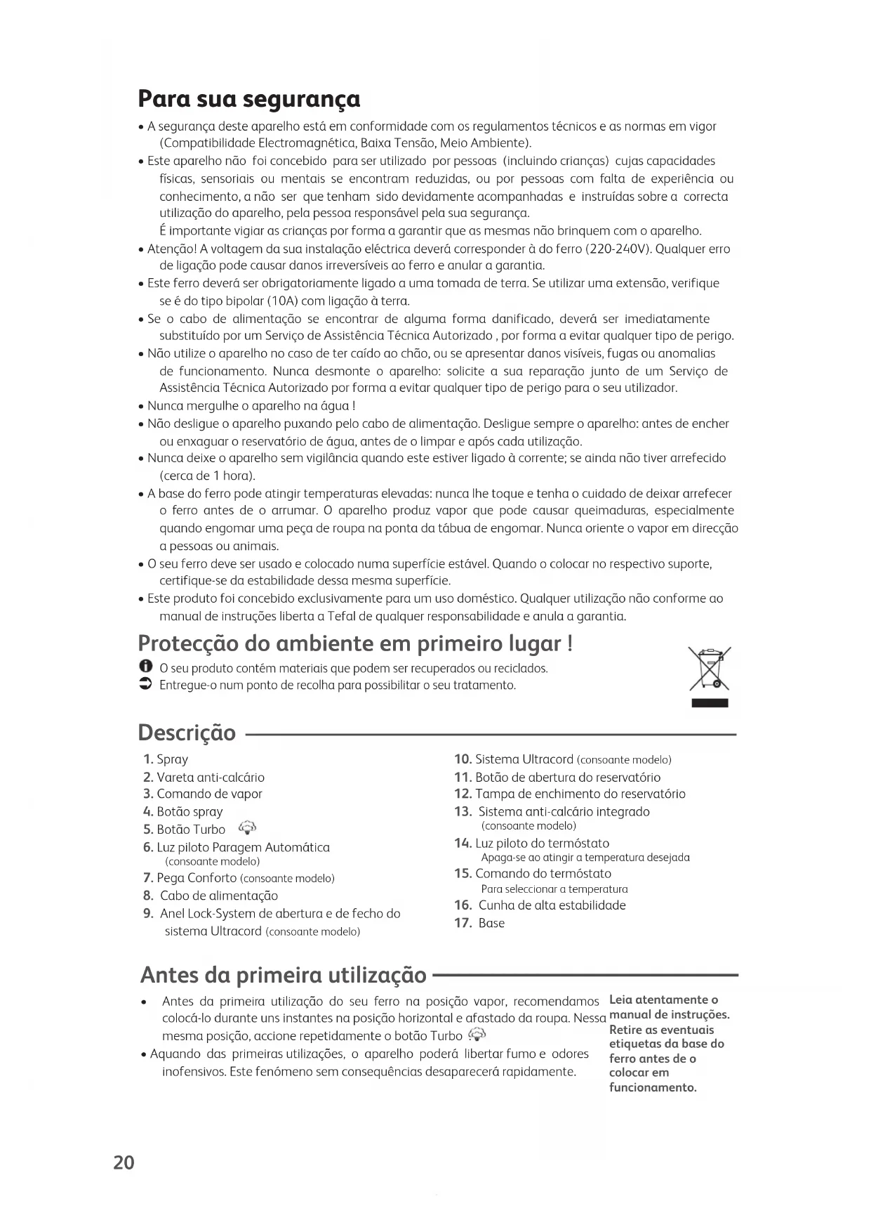 - Este produto foi concebido exclusivamente para um uso doméstico. Qualquer utilização não conforme ao manual de instruções liberta a Tefal de qualquer responsabilidade e anula a garantia. Protecção do ambiente em primeiro lugar ! O seu produto contém materiais que podem ser recuperados ou reciclados.