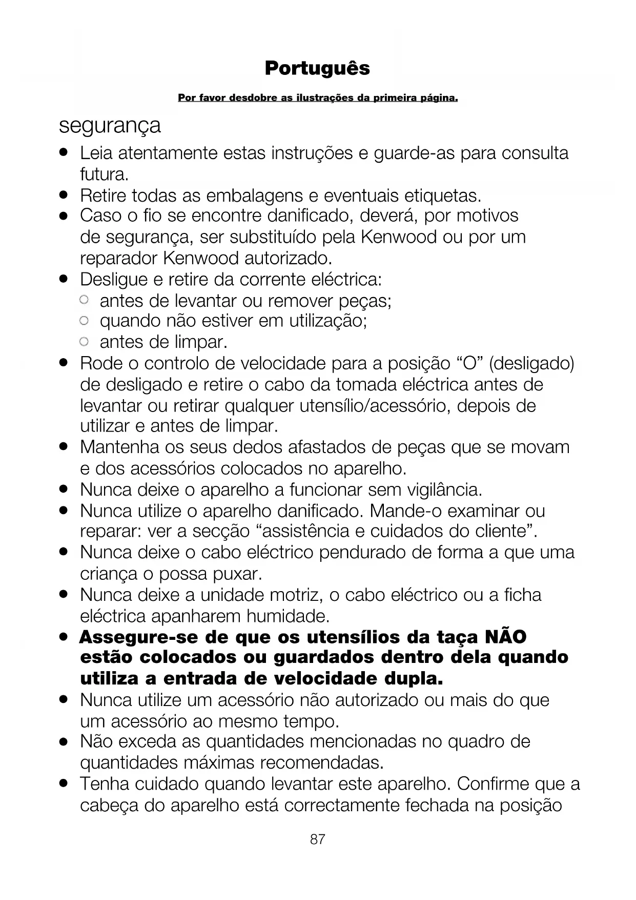 Use o aparelho apenas para o fim doméstico a que se destina. A Kenwood não se responsabiliza caso o aparelho seja utilizado de forma inadequada, ou caso estas instruções não sejam respeitadas.