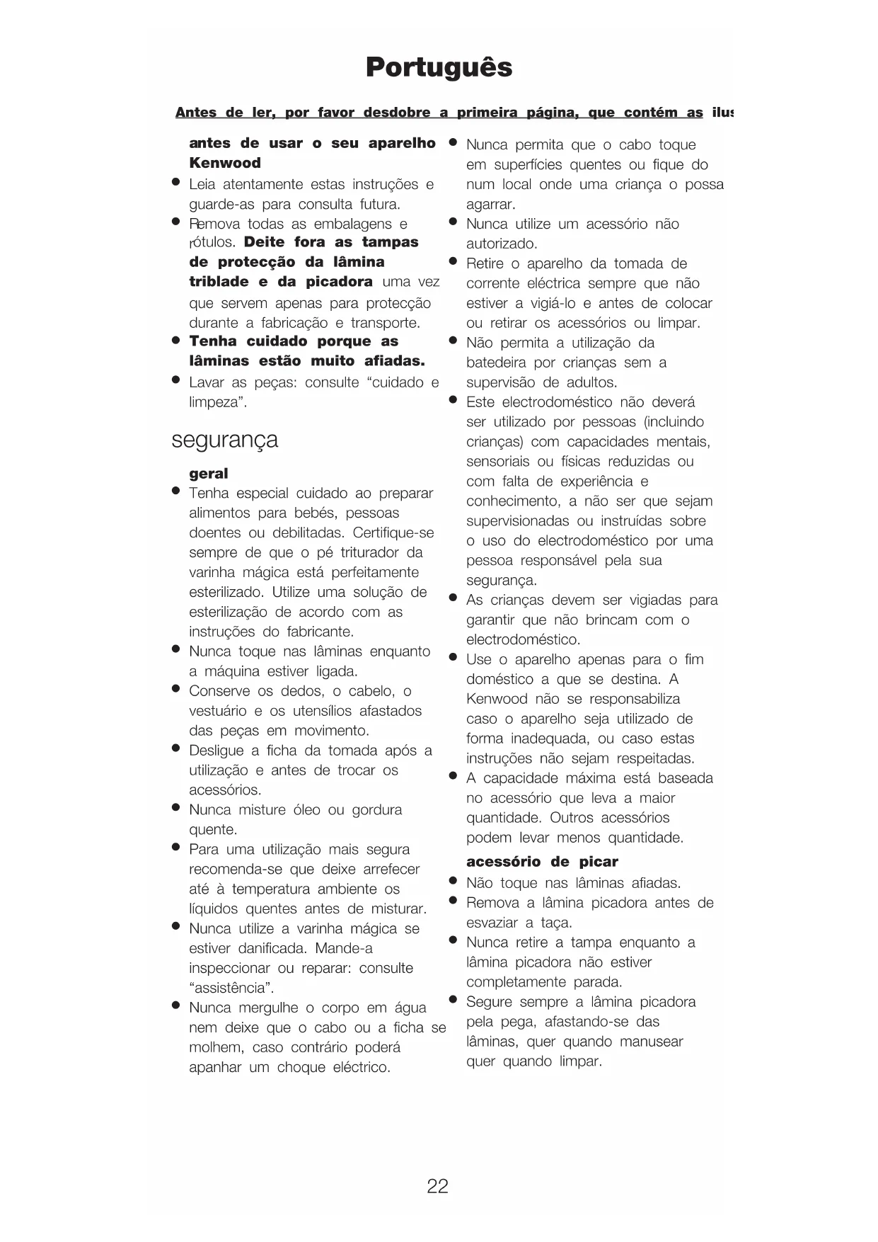 Use o aparelho apenas para o fim doméstico a que se destina. A Kenwood não se responsabiliza caso o aparelho seja utilizado de forma inadequada, ou caso estas instruções não sejam respeitadas.