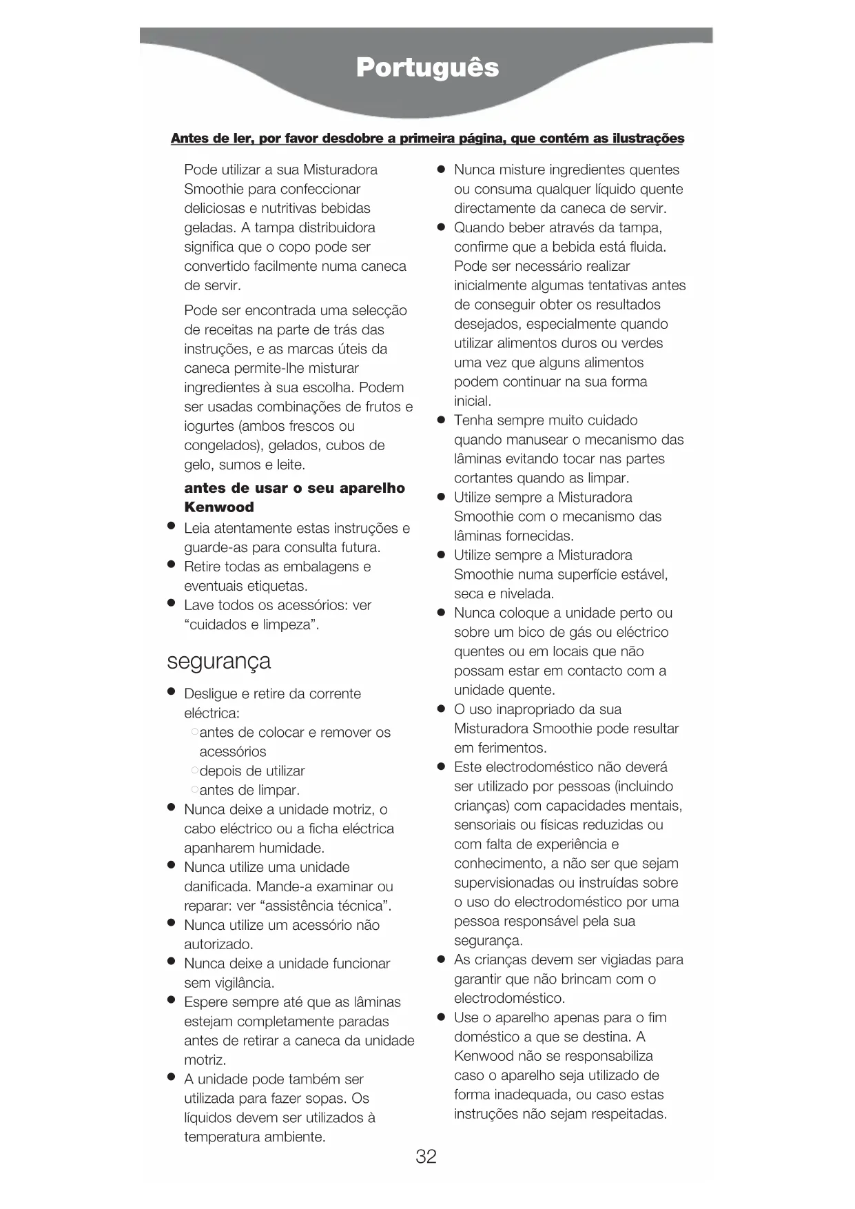 Use o aparelho apenas para o fim doméstico a que se destina. A Kenwood não se responsabiliza caso o aparelho seja utilizado de forma inadequada, ou caso estas instruções não sejam respeitadas. Português