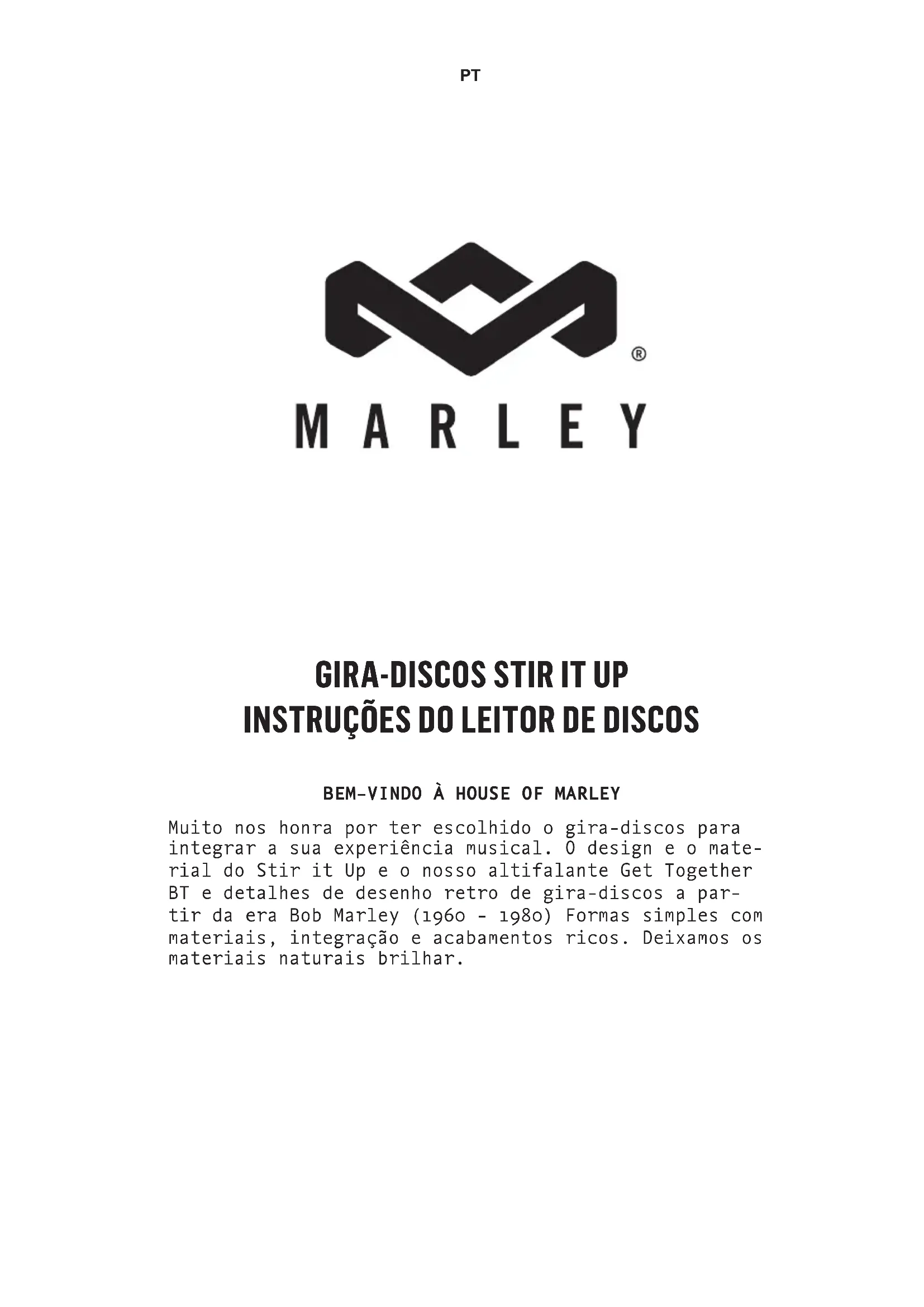Muito nos honra por ter escolhido o gira-discos para integrar a sua experiência musical. O design e o mate- rial do Stir it Up e o nosso altifalante Get Together BT e detalhes de desenho retro de gira-discos a par- tir da era Bob Marley (1960 - 1980) Formas simples com materiais, integração e acabamentos ricos. Deixamos os materiais naturais brilhar. PTPT