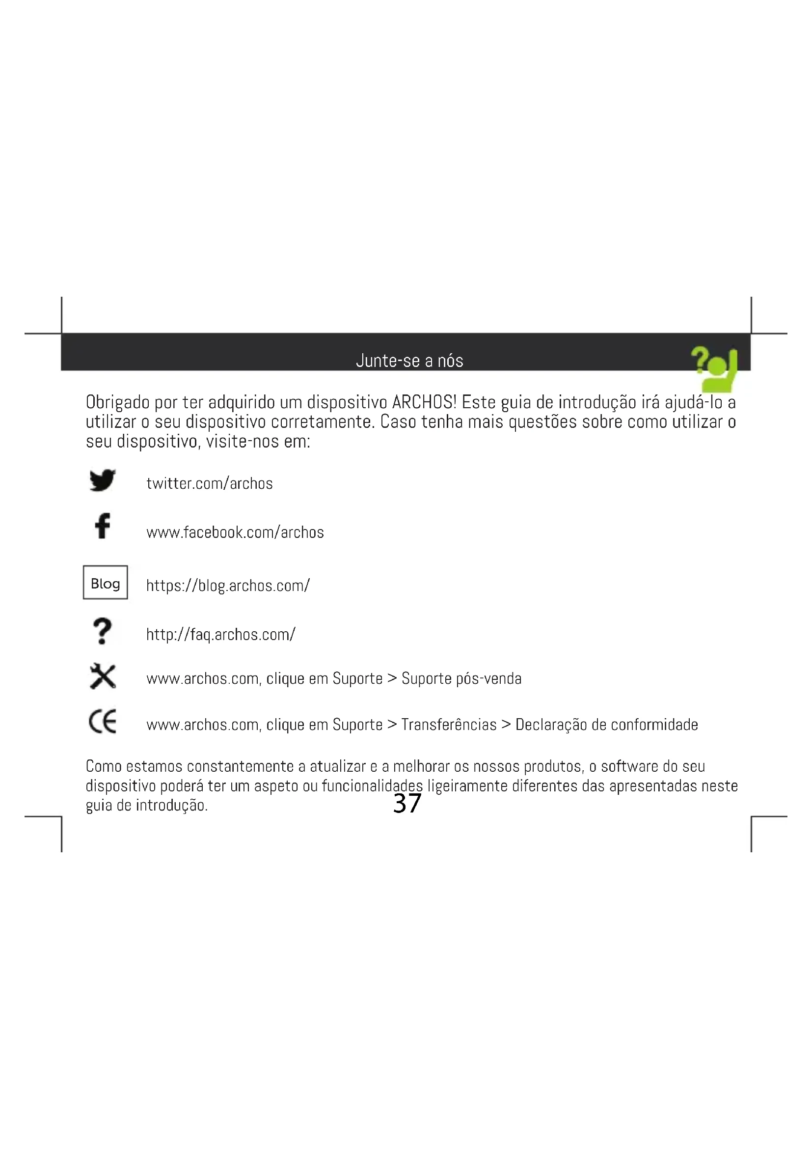 As redes privadas são exibidas com um símbolo de cadeado e precisará de introduzir a sua palavra-passe. Início42 - O meu telefone bloqueou: prima o botão LIGAR/DESLIGAR por mais de 10 segundos ou remova a bateria e colocá-lo de novo no lugar. - Meu dispositivo encontra disfunções: vá para Configurações> Sobre o telefone> Verificar sistema de atualização para verificar se há atualizações. Se o dispositivo é up-to-date, tente reiniciar o dispositivo de Configurações> Restaurar dados de fábrica> Backup e restauração. Recomendamos guardar os ficheiros antes de redefinir. - Se as suas capacidades para Wi-fi forem reduzidas: certifique-se de que não está longe de um hotspot Wi-fi. Atualize o firmware do dispositivo: http://www.archos.com/support. Reponha e redefina os parâmetros de ligação. Contacte o seu prestador de serviços Wi-fi. - Meu bootlogo dispositivo está jogando em um loop: você precisa redefinir completamente o seu dispositivo. Ir para faq.archos.com e selecione seu dispositivo. Em Backup & Recovery, selecione Como reinicializar meus ARCHOS. PARA MAIS RESPOSTAS SOBRE DIFICULDADES TÉCNICAS, NÃO HESITE EM VISITAR: FAQ.ARCHOS.COM Resolução de problemas43 Поздравляем с приобретением устройства ARCHOS! Данное краткое руководство по применению поможет с первых минут правильно пользоваться устройством. Если у вас возникнут другие вопросы относительно применения этого устройства, посетите