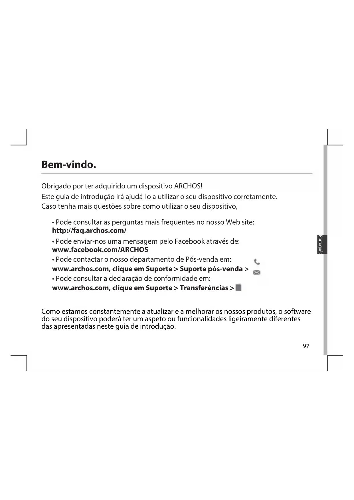 toe te voegen en voer de exacte verbindingsparameters in die u heeft gekregen van uw 3G-aanbieder.97 Português Obrigado por ter adquirido um dispositivo ARCHOS! Este guia de introdução irá ajudá-lo a utilizar o seu dispositivo corretamente. Caso tenha mais questões sobre como utilizar o seu dispositivo,